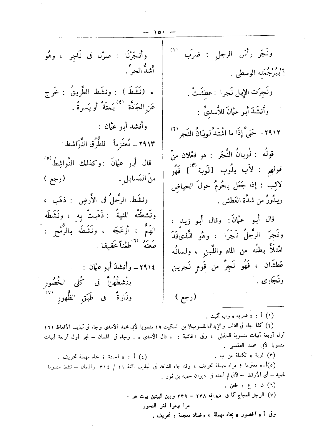 (¬2) كذا جاء فى القلب والإبدال المنسوب لابن السكيت 19 منسوبا لأبى محمد الأسدى وجاء فى تهذيب الألفاظ 464 أول أربعة أبيات منسوبة للحذلمى، وفى الحاشية: «قال الأسدى». وجاء فى اللسان - نجر أول أربعة أبيات منسوبا لأبى محمد الفقعسى.