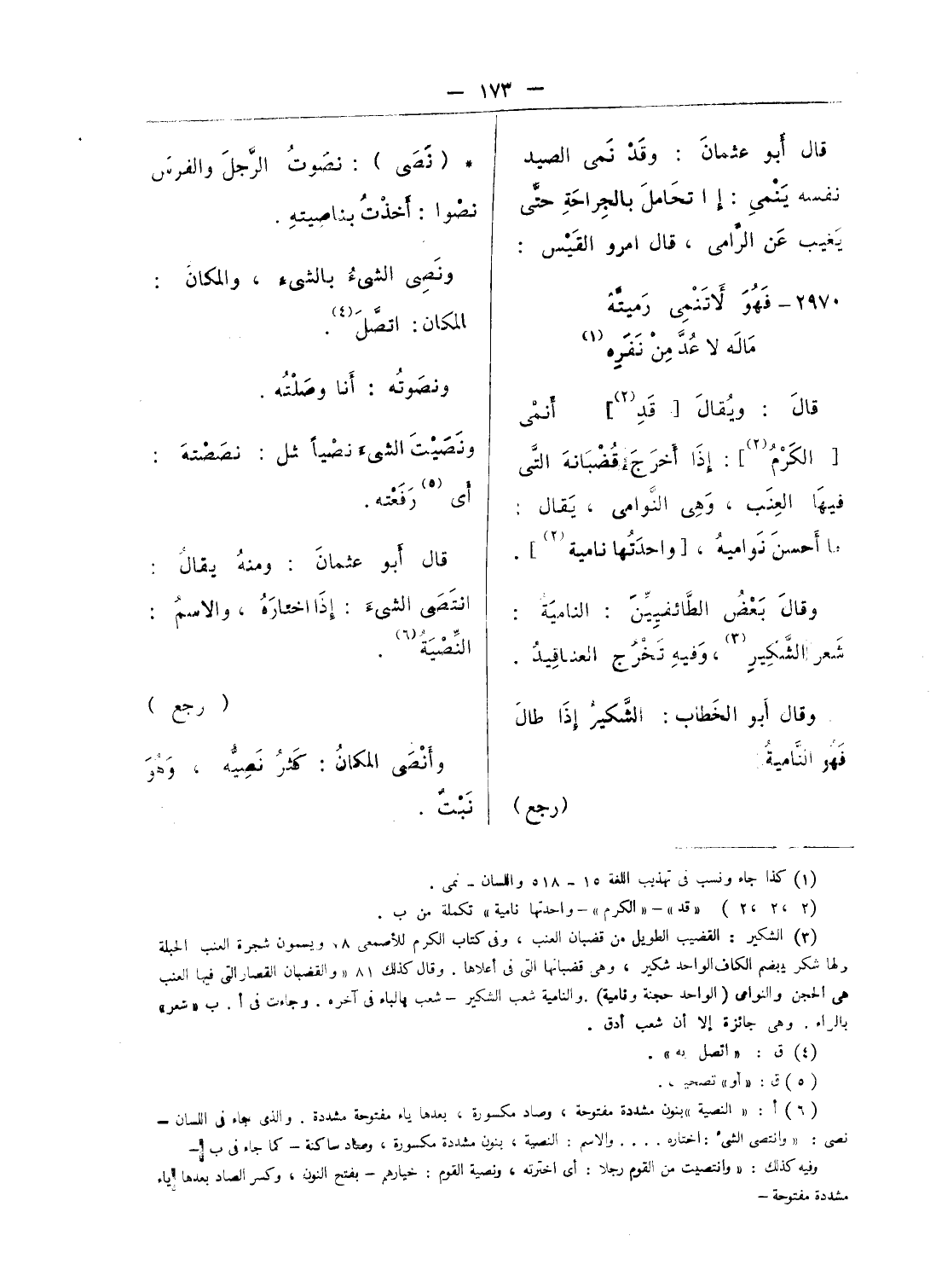 شكير، وهى قضبانها التى فى أعلاها. وقال كذلك 81 «والقضبان القصار التى فيها العنب هى الحجن والنوامى (الواحد حجنة ونامية). والنامية شعب الشكير - شعب بالباء فى آخره. وجاءت فى أ. ب «شعر» بالراء. وهى جائزة إلا أن شعب أدق.