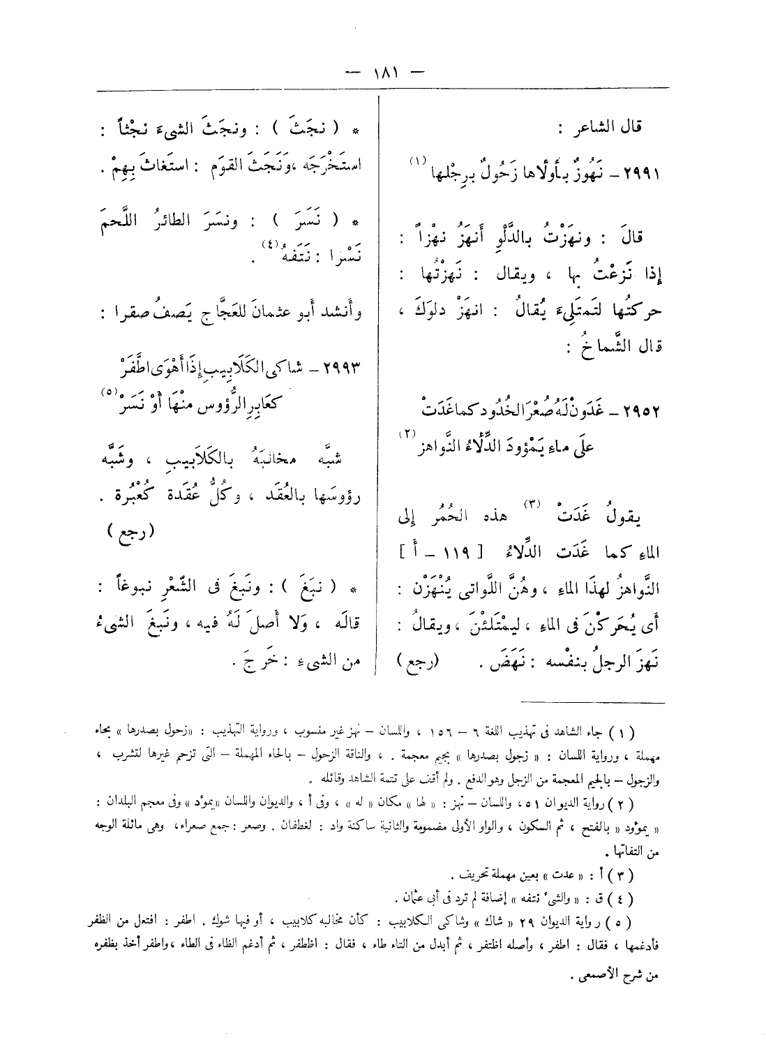 (¬1) جاء الشاهد فى تهذيب اللغة 6 - 156، واللسان - نهز غير منسوب، ورواية التهذيب: «زحول بصدرها» بحاء مهملة، ورواية اللسان: «زجول بصدرها» بجيم معجمة.، والناقة الزحول - بالحاء المهملة - التى تزحم غيرها لتشرب، والزجول - بالجيم المعجمة من الزجل وهو الدفع. ولم أقف على تتمة الشاهد وقائله.
