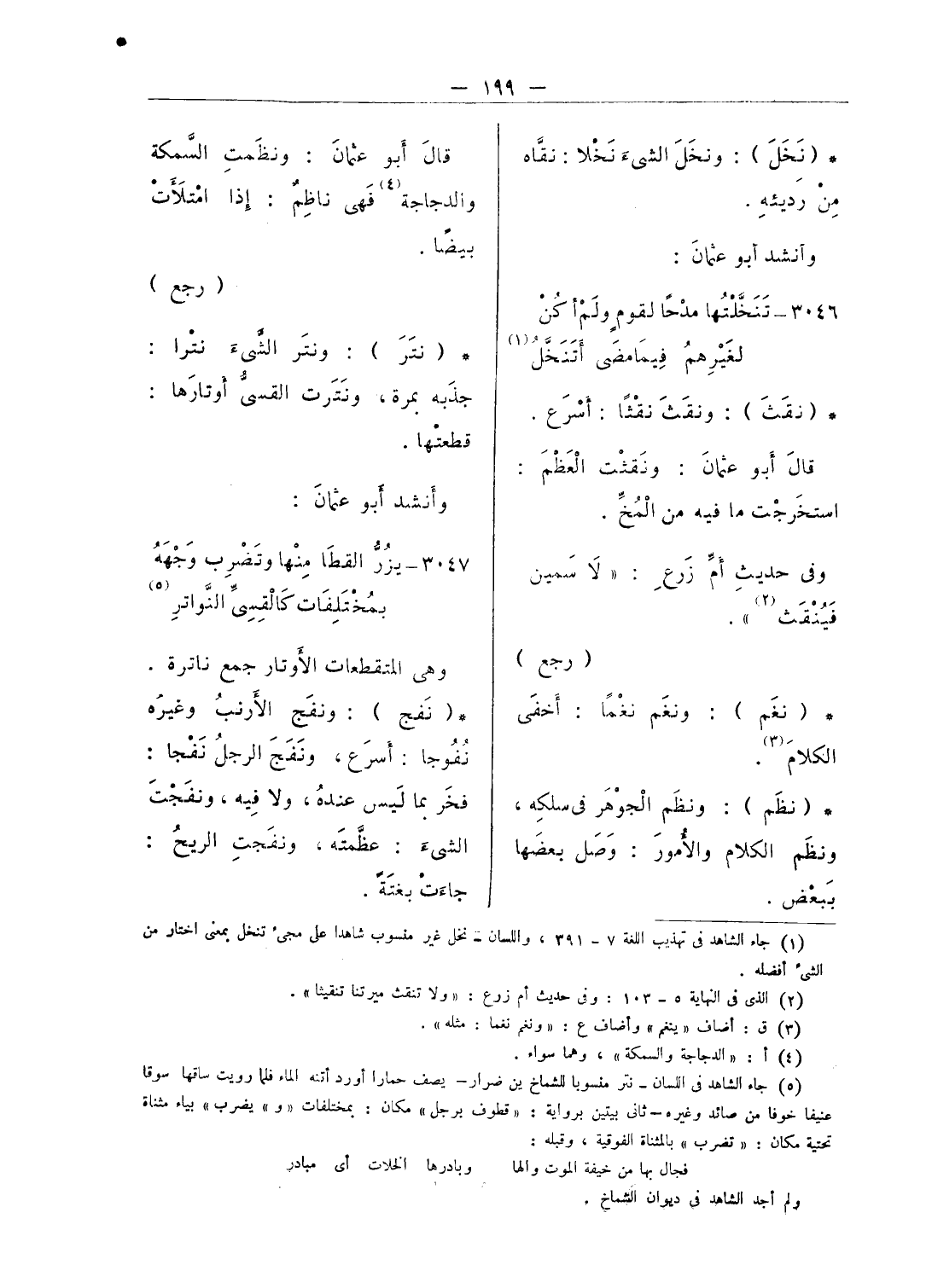 (¬5) جاء الشاهد فى اللسان - نتر منسوبا للشماخ ين ضرار - يصف حمارا أورد أتنه الماء فلما رويت ساقها سوقا عنيفا خوفا من صائد وغيره - ثانى بيتين برواية: «قطوف برجل» مكان: بمختلفات «و» يضرب» بياء مثناة تحتية مكان: «تضرب» بالمثناة الفوقية، وقبله: