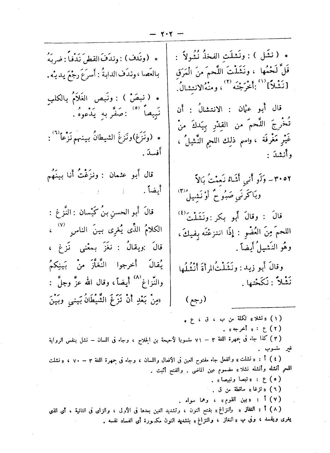 (¬4) أ: «نشلت» والفعل جاء مفتوح العين فى الأفعال واللسان، وجاء فى جمهرة اللغة 3 - 70، «نشلت اللحم أنشله وأنشله نشلا» مضموم عين الماضى. والفتح أثبت.