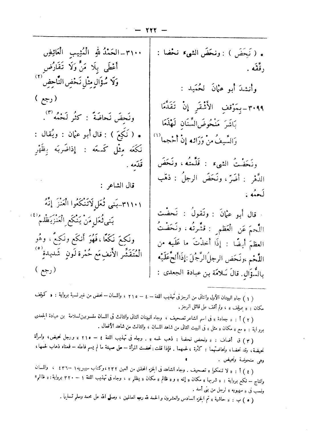 (¬3) ق أضاف: «ونحض نحضا: ذهب لحمه». وجاء فى تهذيب اللغة 4 - 215» ورجل نحيض، وامرأة نحيضة، وقد نحضا، ونحاضتهما: كثرة، لحمهما. فإذا قلت: نحضت المرأة - على صيغة ما لم يسم فاعله - فمعناه ذهاب لحمها، وهى منحوضة وتحيض.