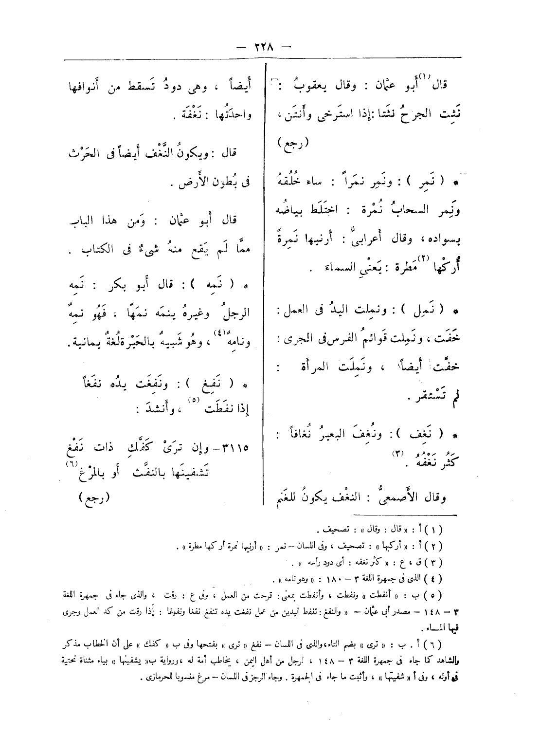 (¬5) ب: «أنفطت» ونفطت، وأنفطت بمعنى: قرحت من العمل، وفى ع: رقت، والذى جاء فى جمهرة اللغة 3 - 148 - مصدر أبى عثمان - «والنفغ: تنفط اليدين من عمل نفغت يده تنفغ نفغا ونفوغا: إذا رقت من كد العمل وجرى فيها الماء.