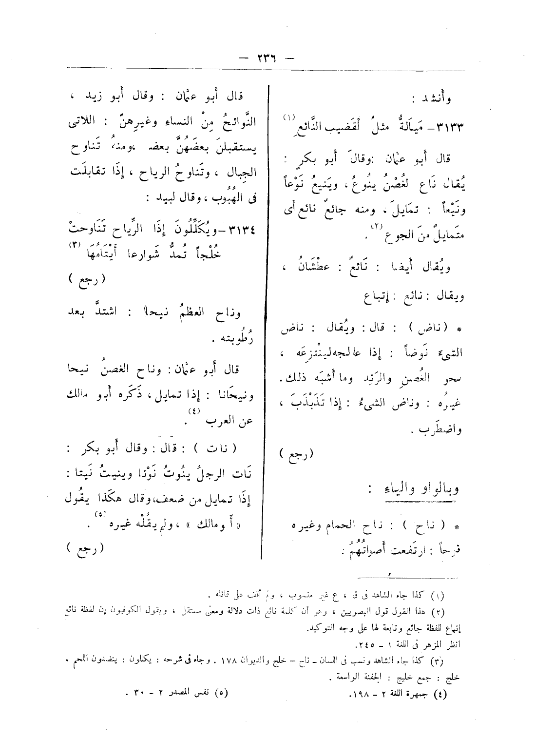 قال أبو عثمان: وقال أبو زيد، النّوائح من النساء وغيرهنّ: اللاتى يستقبلن بعضهنّ بعض، ومنه تناوح الجبال، وتناوح الرياح، إذا تقابلت فى الهبوب، وقال لبيد: