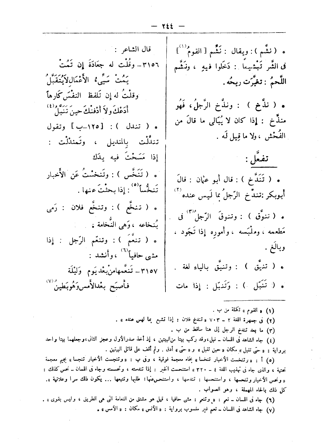 (¬6) جاء فى اللسان - نعم: «وتنعم: مشى حافيا، قيل هو مشتق من النعامة التى هى الطريق، وليس بقوى».