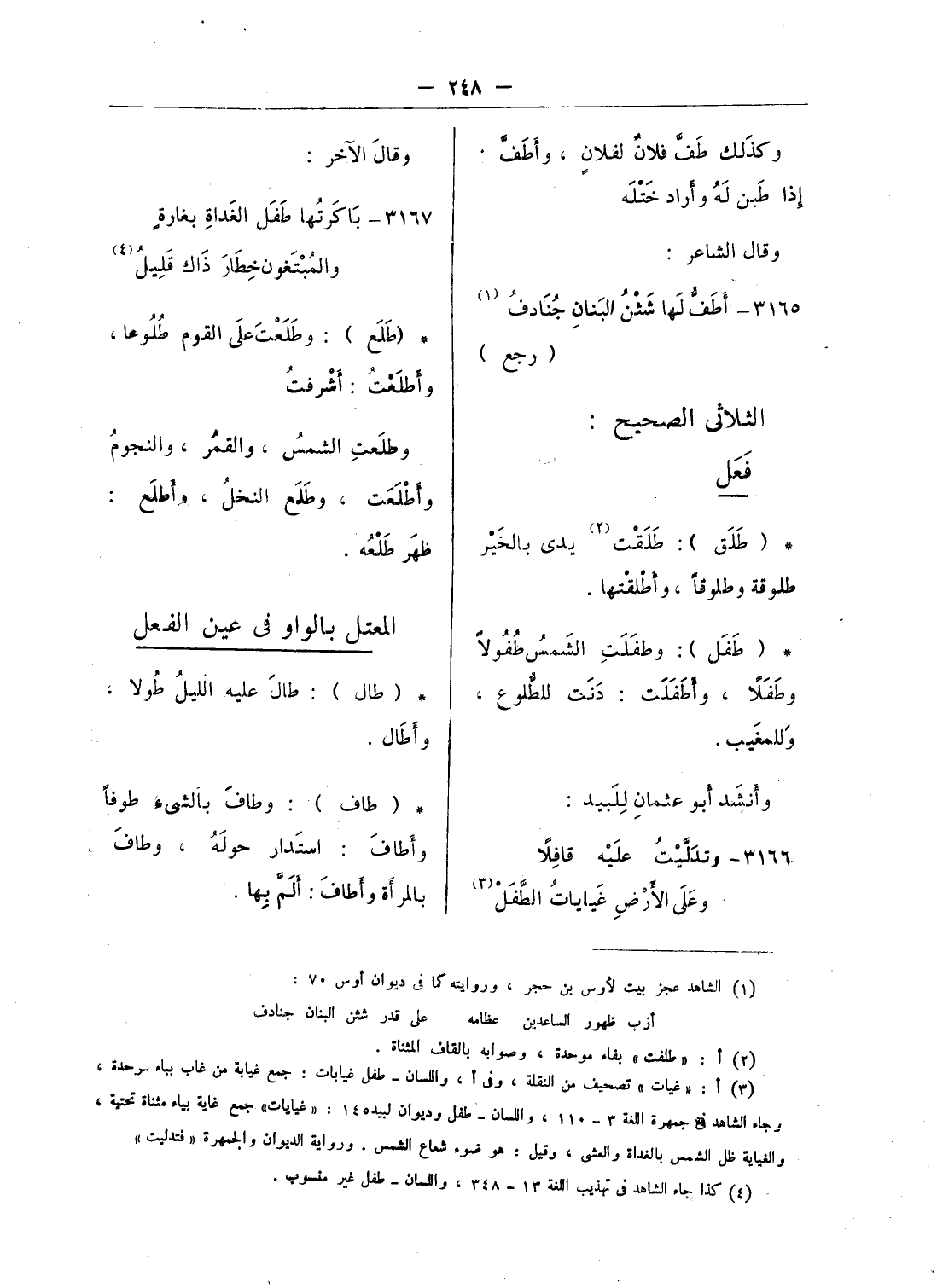 (¬3) أ: «غياث» تصحيف من النقلة، وفى أ، واللسان - طفل غيابات: جمع غيابة من غاب بباء موحدة، وجاء الشاهد فى جمهرة اللغة 3 - 110، واللسان - طفل وديوان لبيد 145: «غيابات» جمع غاية بياء مثناة تحتية، والغيابة ظل الشمس بالغداة والعشى، وقيل: هو ضوء شعاع الشمس. ورواية الديوان والجمهرة «فتدليت».