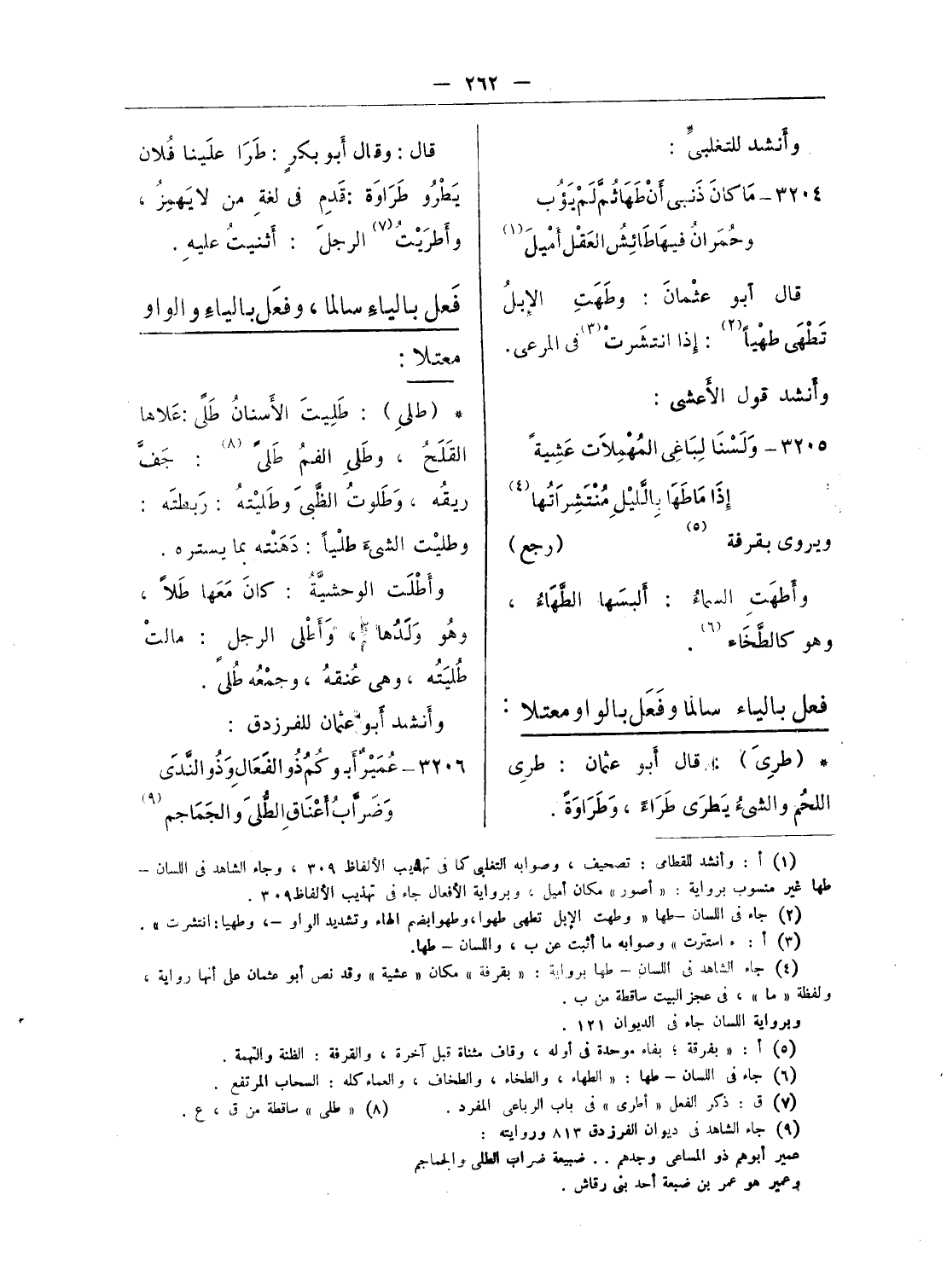 (¬1) أ: وأنشد للقطامى: تصحيف، وصوابه التغلبى كما فى تهذيب الألفاظ 309، وجاء الشاهد فى اللسان - طها غير منسوب برواية: «أصور» مكان أميل، وبرواية الأفعال جاء فى تهذيب الألفاظ 309.