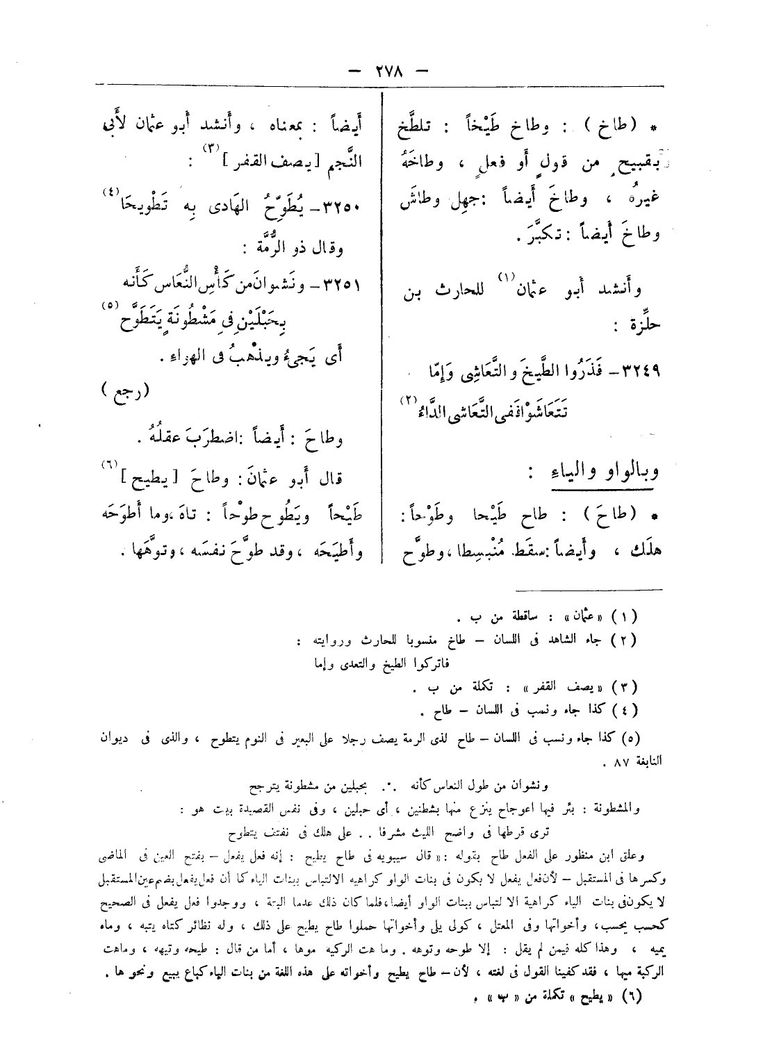 وعلق ابن منظور على الفعل طاح بقوله: «قال سيبويه فى طاح يطيح: إنه فعل يفعل ... بفتح العين فى الماضى وكسرها فى المستقبل - لأن فعل يفعل لا يكون فى بنات الواو كراهية الالتباس ببنات الياء كما أن فعل يفعل بضم عين المستقبل لا يكون فى بنات الياء كراهية الالتباس ببنات الواو أيضا، فلما كان ذلك عدما البتة، ووجدوا فعل يفعل فى الصحيح كحسب يحسب، وأخواتها وفى المعتل، كولى يلى وأخواتها حملوا طاح يطيح على ذلك، وله نظائر كتاه يتبه، وماه يميه، وهذا كله فيمن لم يقل: إلا طوحه وتوهه. وماهت الركيه موها، أما من قال: طيحه وتيهه، وماهت الركية ميها، فقد كفينا القول فى لغته، لأن - طاخ يطيح وأخواته على هذه اللغة من بنات الياء كباع يبيع ونحوها.