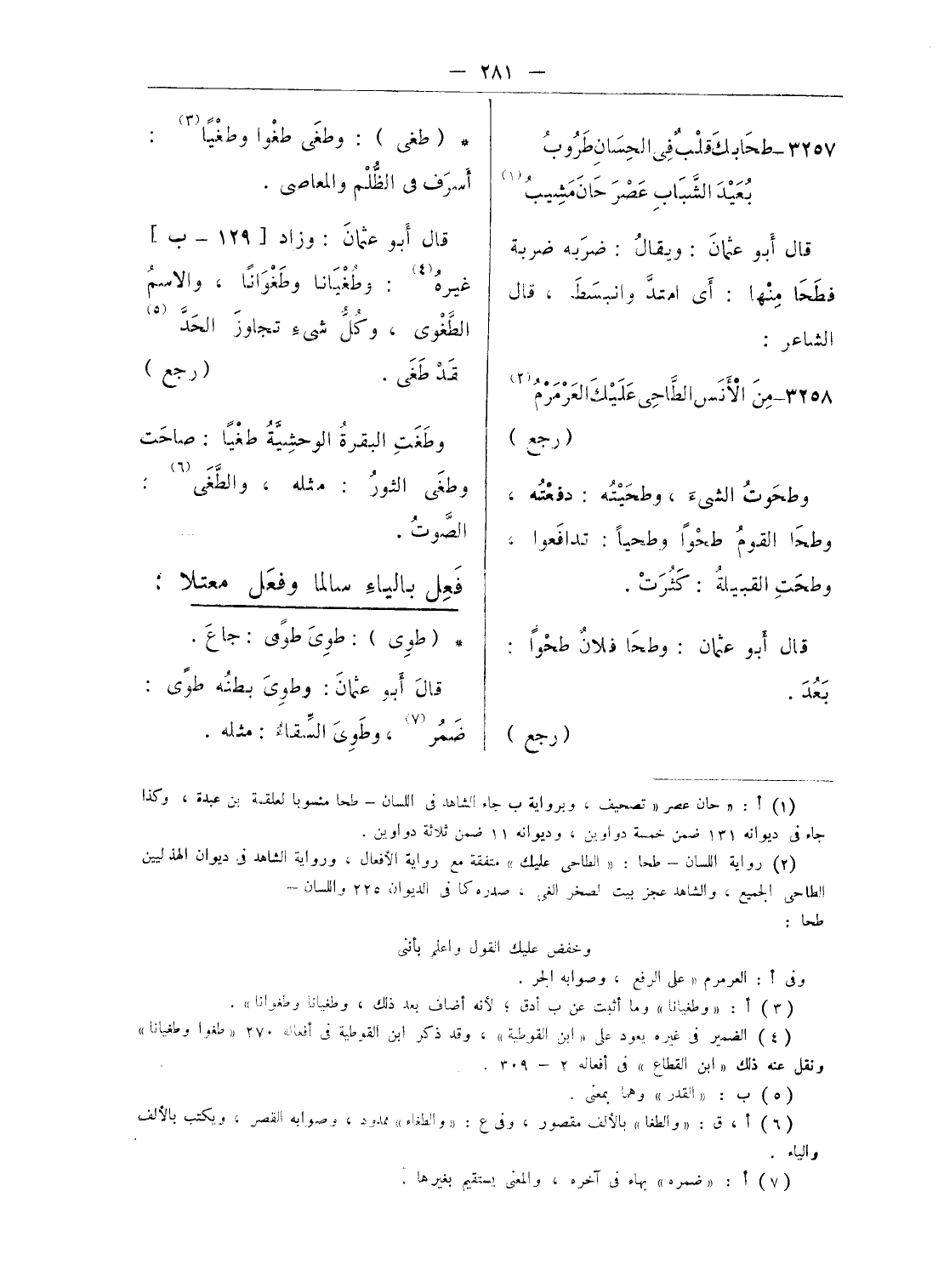 (¬2) رواية اللسان - طحا: «الطاحى عليك» متفقة مع رواية الأفعال، ورواية الشاهد فى ديوان الهذليين الطاحى الجميع، والشاهد عجز بيت لصخر الغى، صدره كما فى الديوان 225 واللسان - طحا: