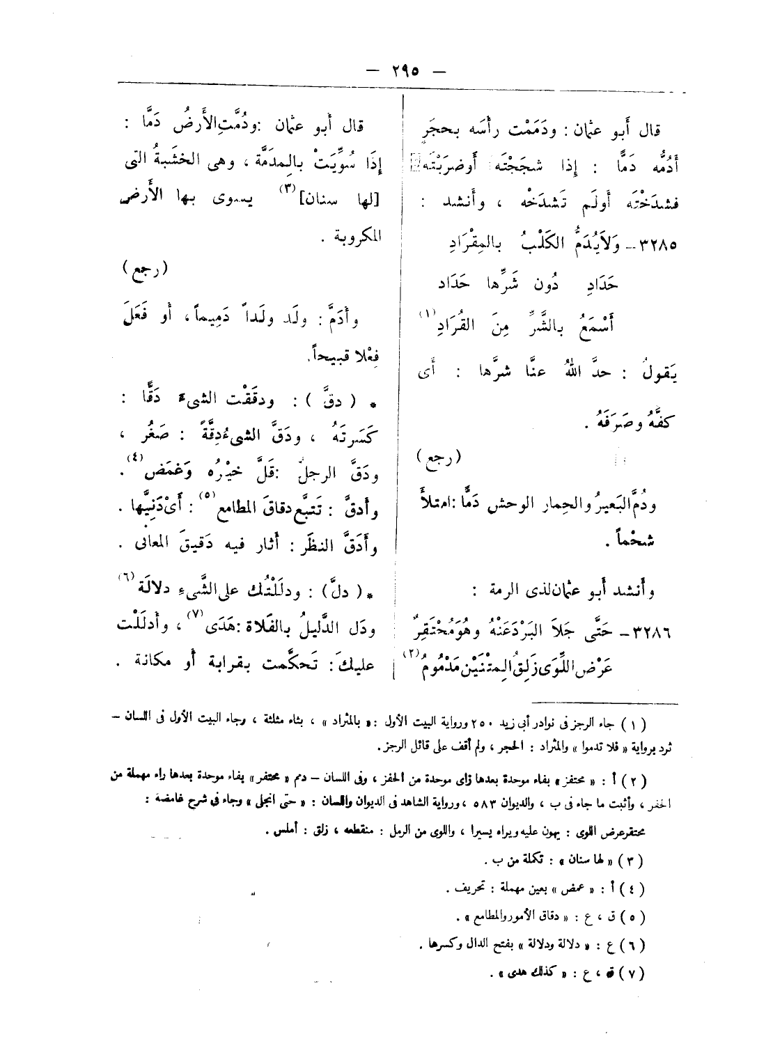 (¬1) جاء الرجز فى نوادر أبى زيد 250 ورواية البيت الأول: «بالمثراد»، بثاء مثلثة، وجاء البيت الأول فى اللسان - ثرد برواية «فلا تدموا»