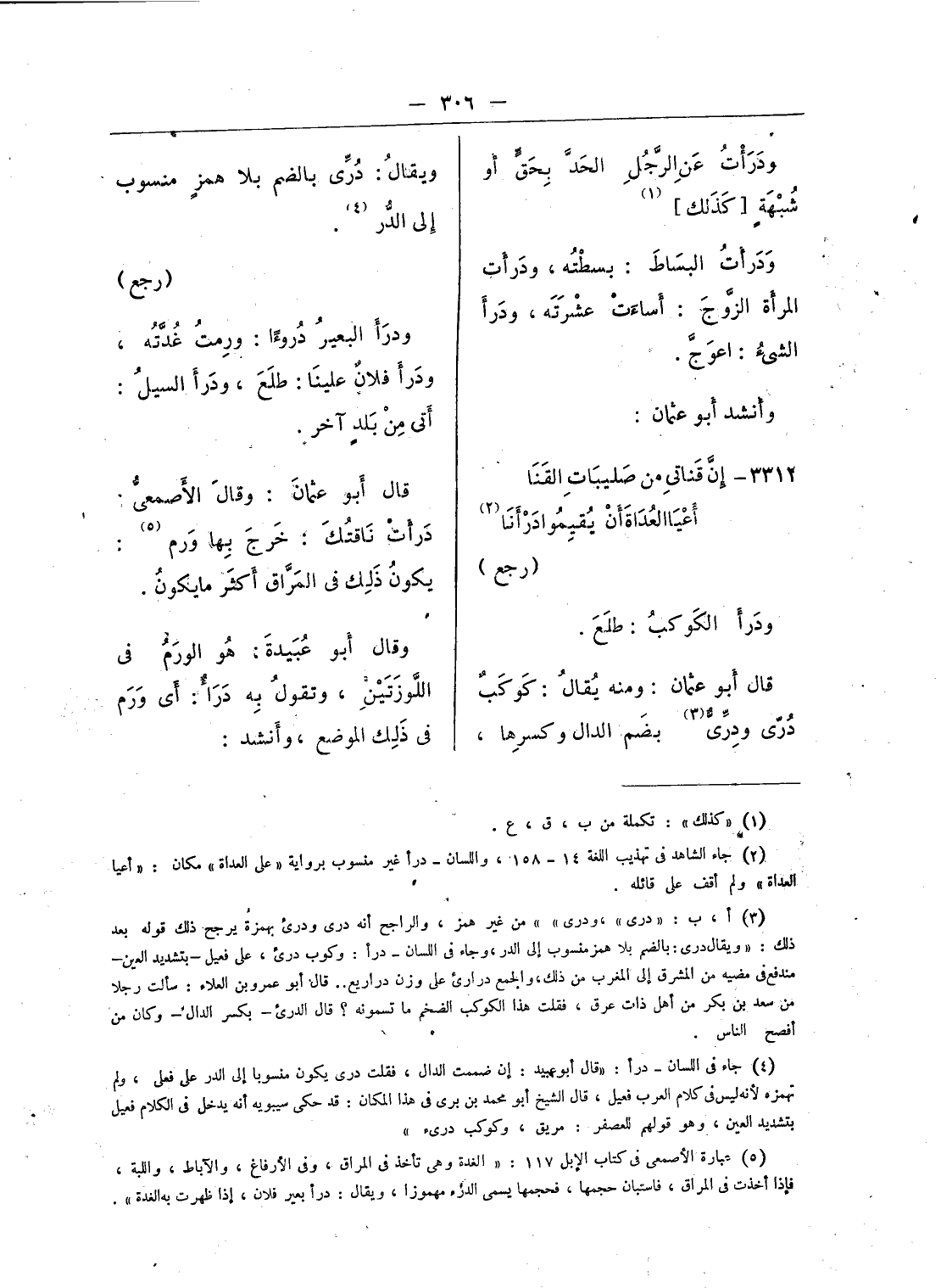 (¬3) أ، ب: «درى»، ودرى» من غير همز، والراجح أنه درى ودرئ بهمزة يرجح ذلك قوله بعد ذلك: «ويقال درى: بالضم بلا همز منسوب إلى الدر، وجاء فى اللسان - درأ: وكوب درئ، على فعيل - بتشديد العين - مندفع فى مضيه من المشرق إلى المغرب من ذلك، والجمع درارئ على وزن دراريع .. قال أبو عمرو بن العلاء: سألت رجلا من سعد بن بكر من أهل ذات عرق، فقلت هذا الكوكب الضخم ما تسمونه؟ قال الدرئ - بكسر الدال - وكان من أفصح الناس.