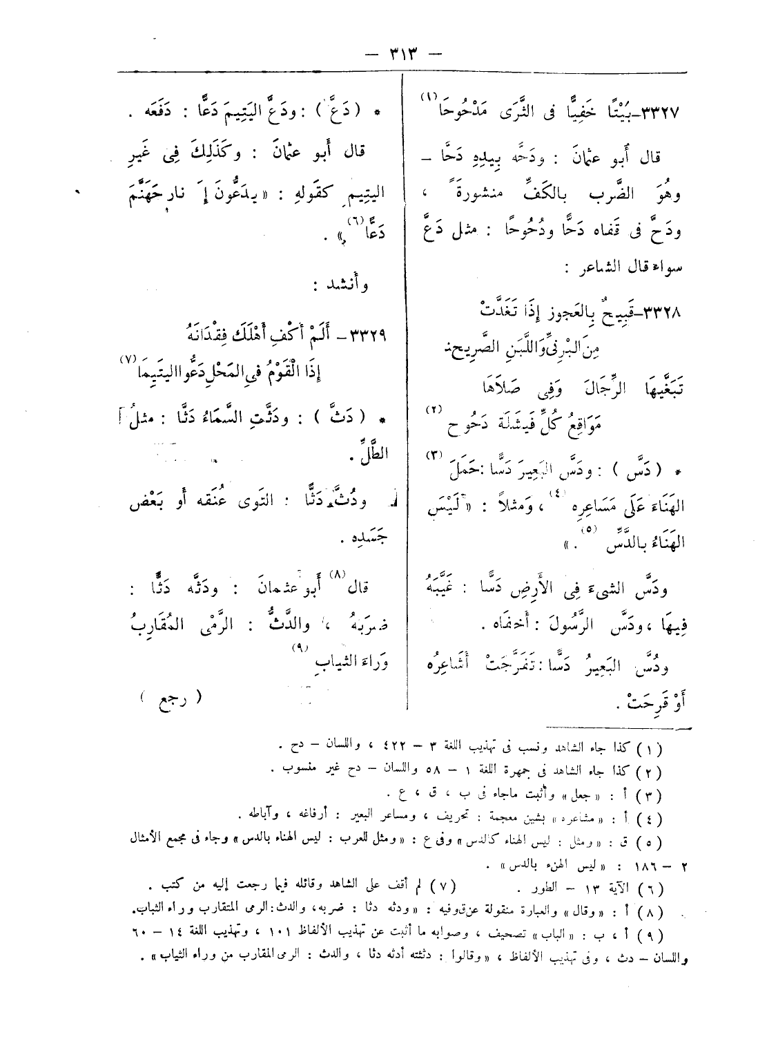 ودسّ البعير دسّا: حمل (¬3) الهناء على مساعره (¬4)، ومثلا: «ليس الهناء بالدّسّ (¬5).»