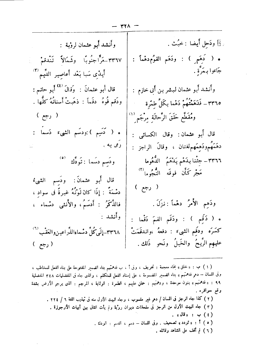 (¬1) ب: «خلق» بخاء معجمة: تحريف، وفى أ، ب فدهمتهم بتاء الضمير المفتوحة على بناء الفعل للمخاطب، وفى اللسان - دهم فدهمتهم» بتاء الضمير المضمومة، على إسناد الفعل للمتكلم، والذى جاء فى المفضليات 348 المفضلية 99: «فدهمنهم» بنون موحدة، ودهمنهم: حملن عليهم، الطمرة: الوثابة، المرجم: الذى يرجم الأرض بشدة وقع حوافره.