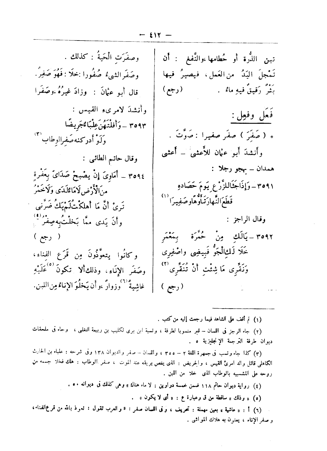 (¬3) كذا جاء ونسب فى جمهرة اللغة 2 - 355، واللسان - صفر والديوان 138 وفى شرحه: علباء بن الحارث الكاهلى قاتل والد امرئ القيس، والجريض: الذى يغص بريقه عند الموت، صفر الوطاب: هلك فخلا جسمه من روحه على التشبيه بالوطاب الذى خلا من اللبن.