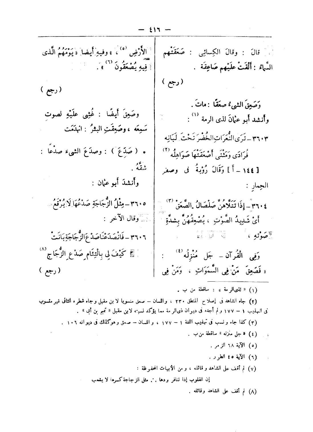 (¬2) جاء الشاهد فى إصلاح المنطق 230، واللسان - صعق منسوبا لابن مقبل وجاء شطره الثانى غير منسوب فى التهذيب 1 - 177 ولم أجده فى ديوان ذى الرمة مما يؤكد نسبته لابن مقبل «تميم بن أبى».