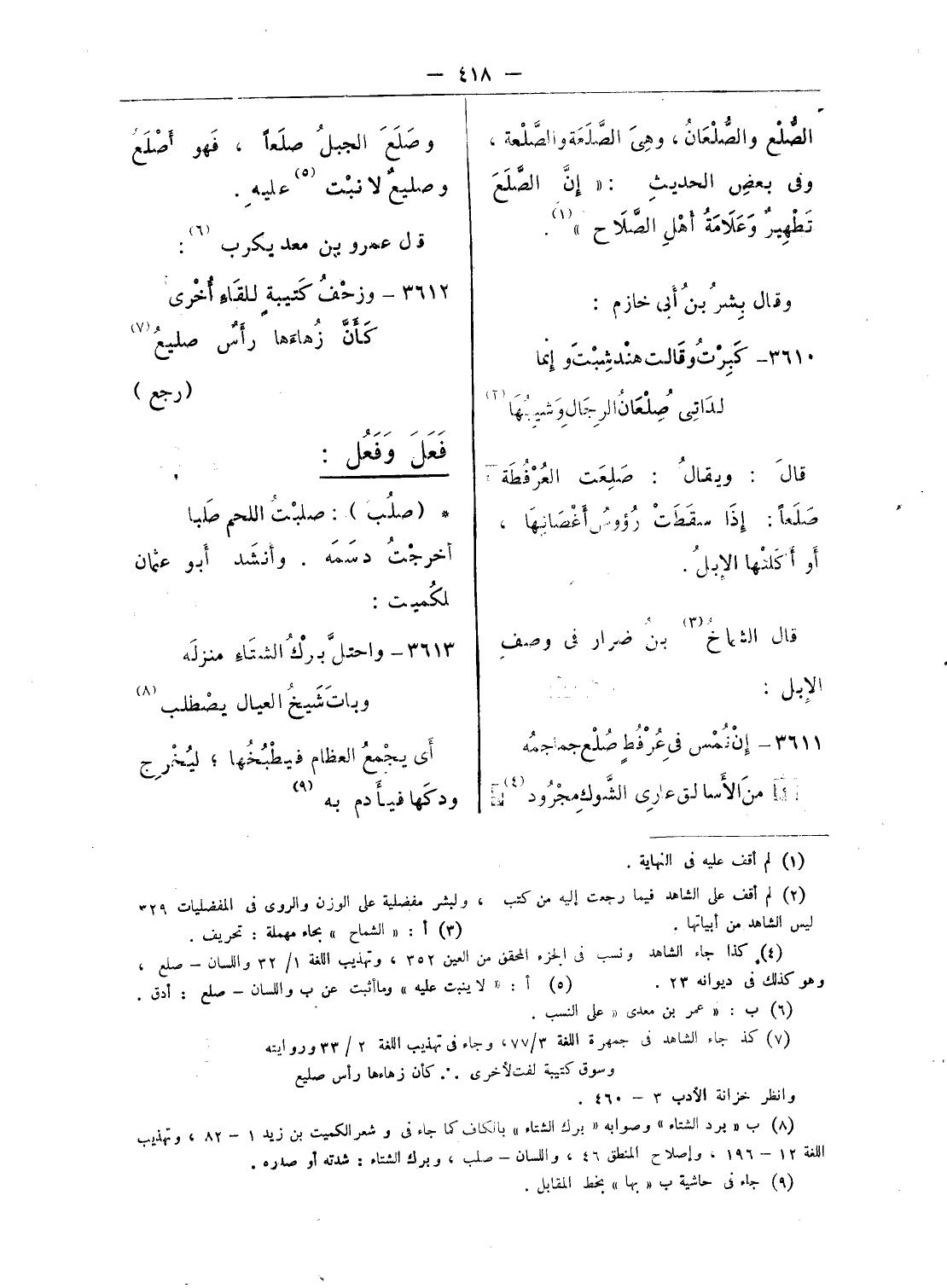 (¬8) ب «برد الشتاء» وصوابه «برك الشتاء» بالكاف كما جاء فى وشعر الكميت بن زيد 1 - 82، وتهذيب اللغة 12 - 196، وإصلاح المنطق 46، واللسان - صلب، وبرك الشتاء: شدته أو صدره.