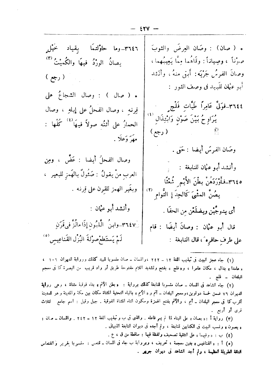 (¬1) جاء عجز البيت فى تهذيب اللغة 12 - 242، واللسان - صان منسوبا للبيد كذلك ورواية الديوان 106، «عامدا» بدال، مكان عامرا، و «فلج» بفتح وتشديد اللام مفتوحة طريق أو واد قريب من البصرة كما فى معجم البلدان - فلج.