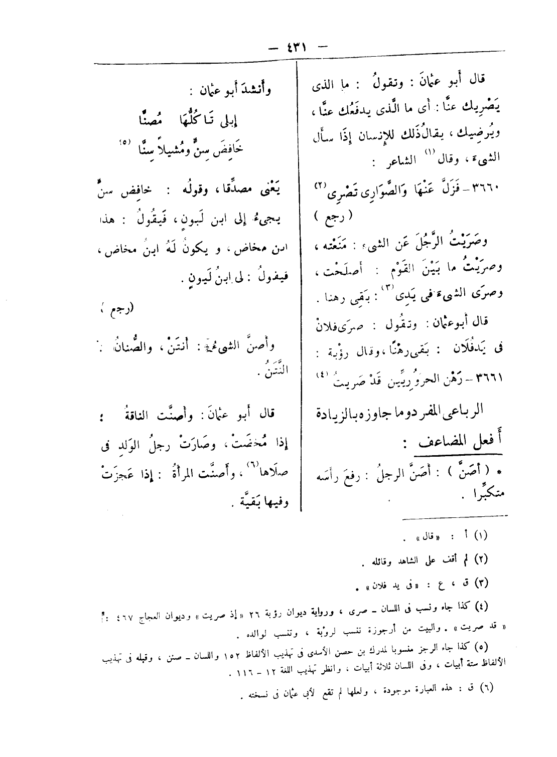 قال أبو عثمان: وتقول: ما الذى يصريك عنّا: أى ما الّذى يدفعك عنّا، ويرضيك، يقال ذلك للإنسان إذا سأل الشئ، وقال (¬1) الشاعر: