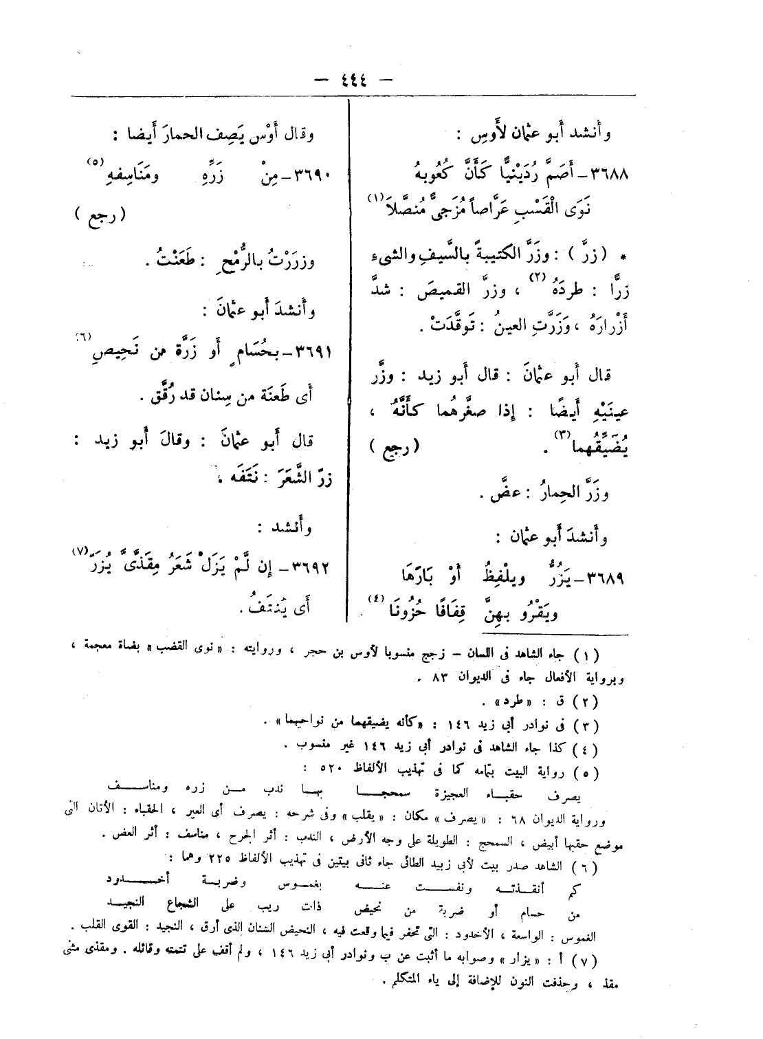 ورواية الديوان 68: «يصرف» مكان: «يقلب» وفى شرحه: يصرف أى العير، الحقباء: الأتان الى موضع حقبها أبيض، السمحج: الطويلة على وجه الأرض، الندب: أثر الجرح، مناسف: أثر العض.