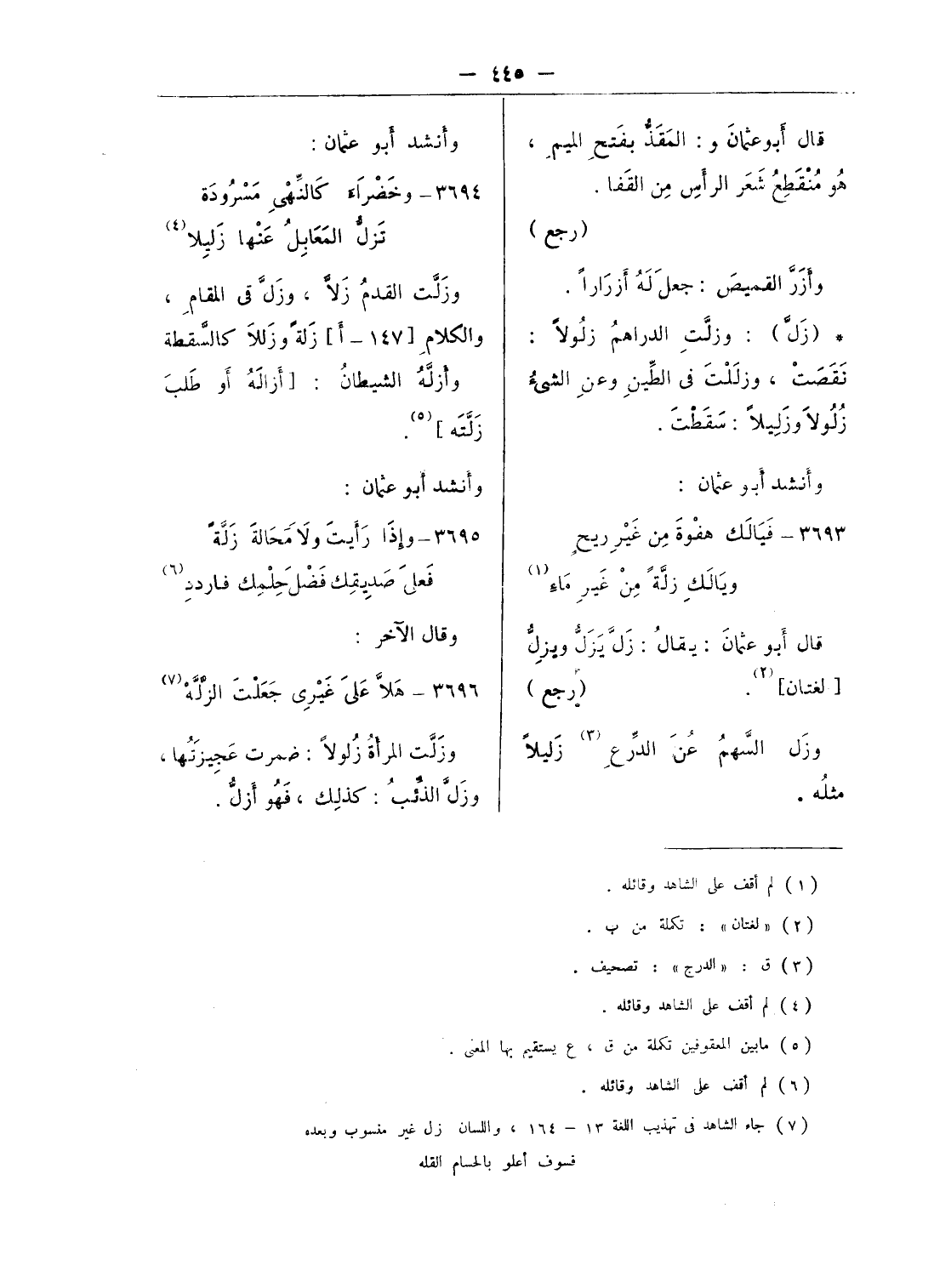 (¬7) جاء الشاهد فى تهذيب اللغة 13 - 164، واللسان زل غير منسوب وبعده