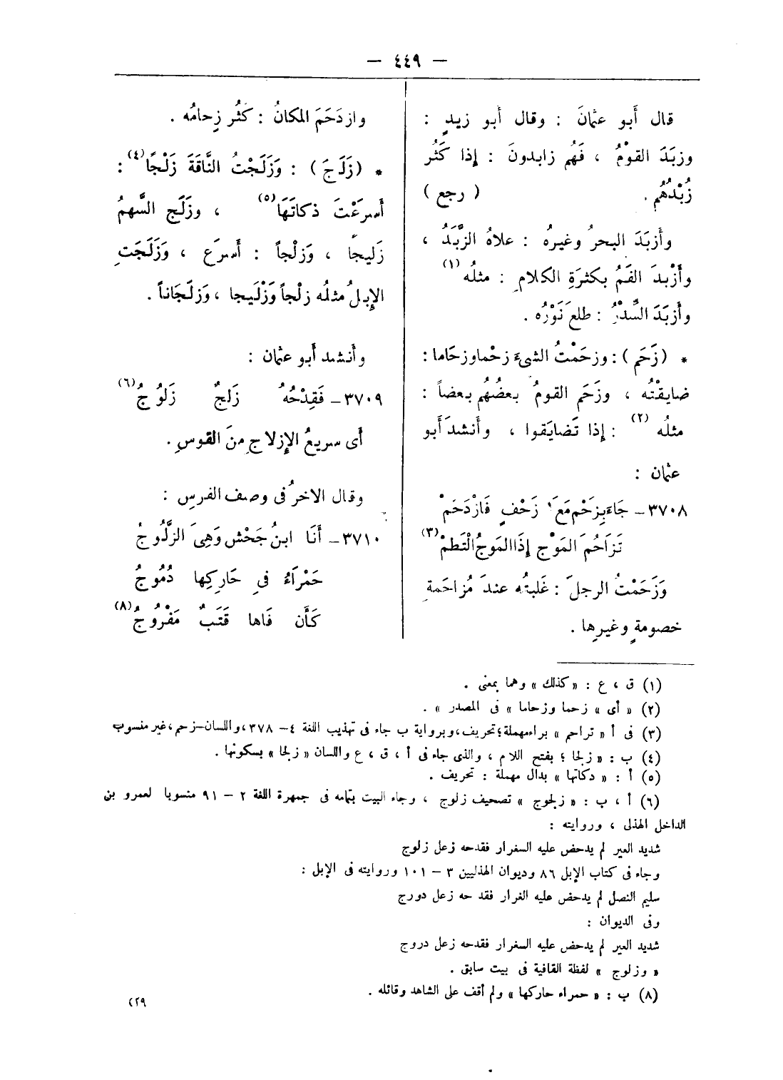 (¬6) أ، ب: «زلجوج» تصحيف زلوج، وجاء البيت بتمامه فى جمهرة اللغة 2 - 91 منسوبا لعمرو بن الداخل الهذلى، وروايته: