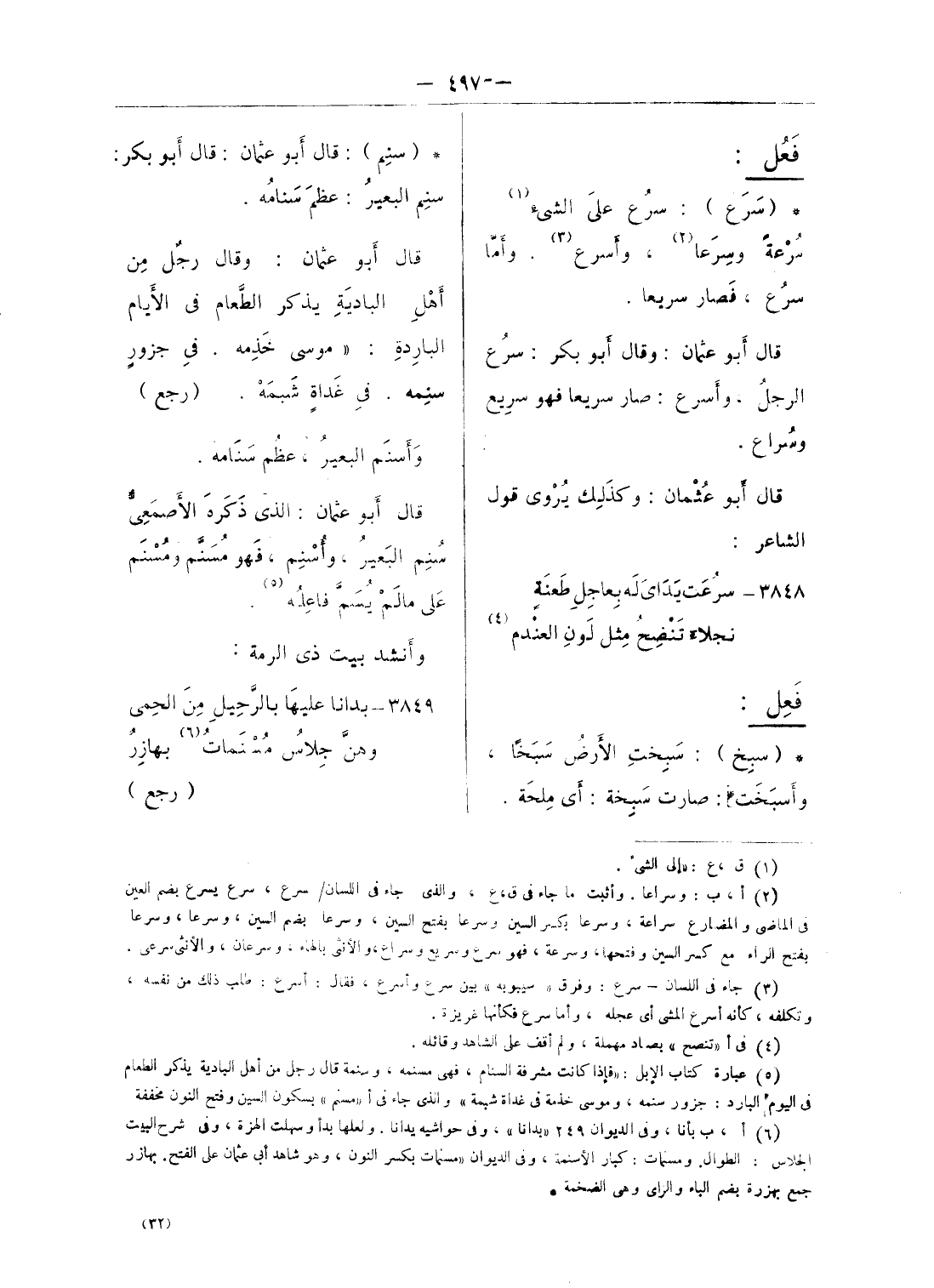 (¬2) أ، ب: وسراعا. وأثبت ما جاء فى ق، ع، والذى جاء فى اللسان/ سرع، سرع يسرع بضم العين فى الماضى والمضارع سراعة، وسرعا بكسر السين وسرعا بفتح السين، وسرعا بضم السين، وسرعا، وسرعا بفتح الراء مع كسر السين وفتحها، وسرعة، فهو سرع وسريع وسراع، والأنثى بالهاء، وسرعان، والأنثى سرعى.