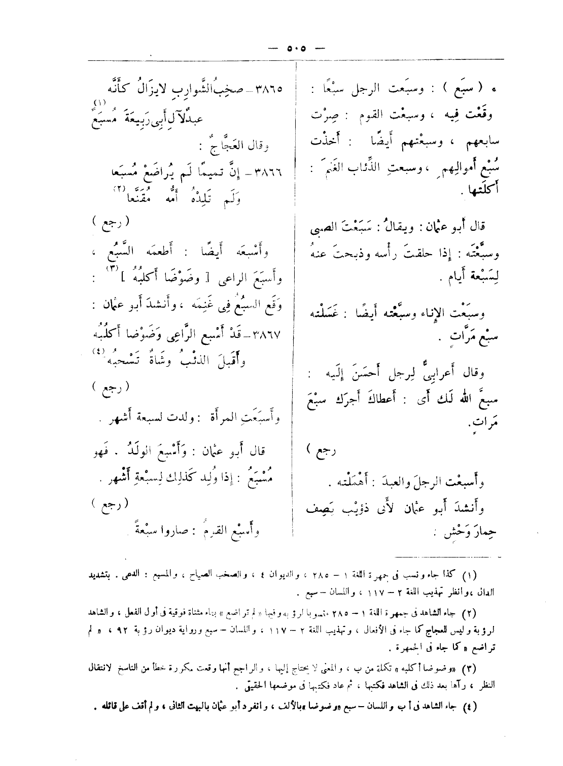 (¬2) جاء الشاهد فى جمهرة اللغة 1 - 285 منسوبا لرؤبة وفيها «لم تراضع» بتاء مثناة فوقية فى أول الفعل، والشاهد لرؤبة وليس للعجاج كما جاء فى الأفعال، وتهذيب اللغة 2 - 117، واللسان - سبع ورواية ديوان رؤبة 92، «لم تراضع» كما جاء فى الجمهرة.