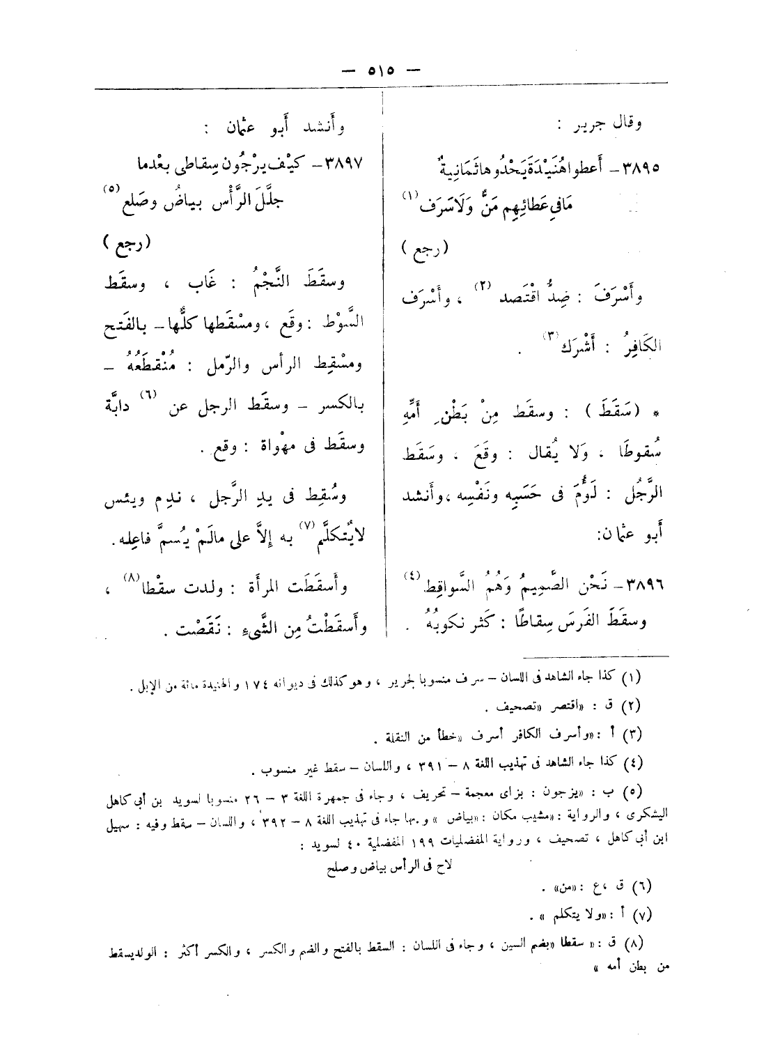 (¬8) ق: «سقطا «بضم السين، وجاء فى اللسان: السقط بالفتح والضم والكسر، والكسر أكثر: الولد يسقط من بطن أمه».