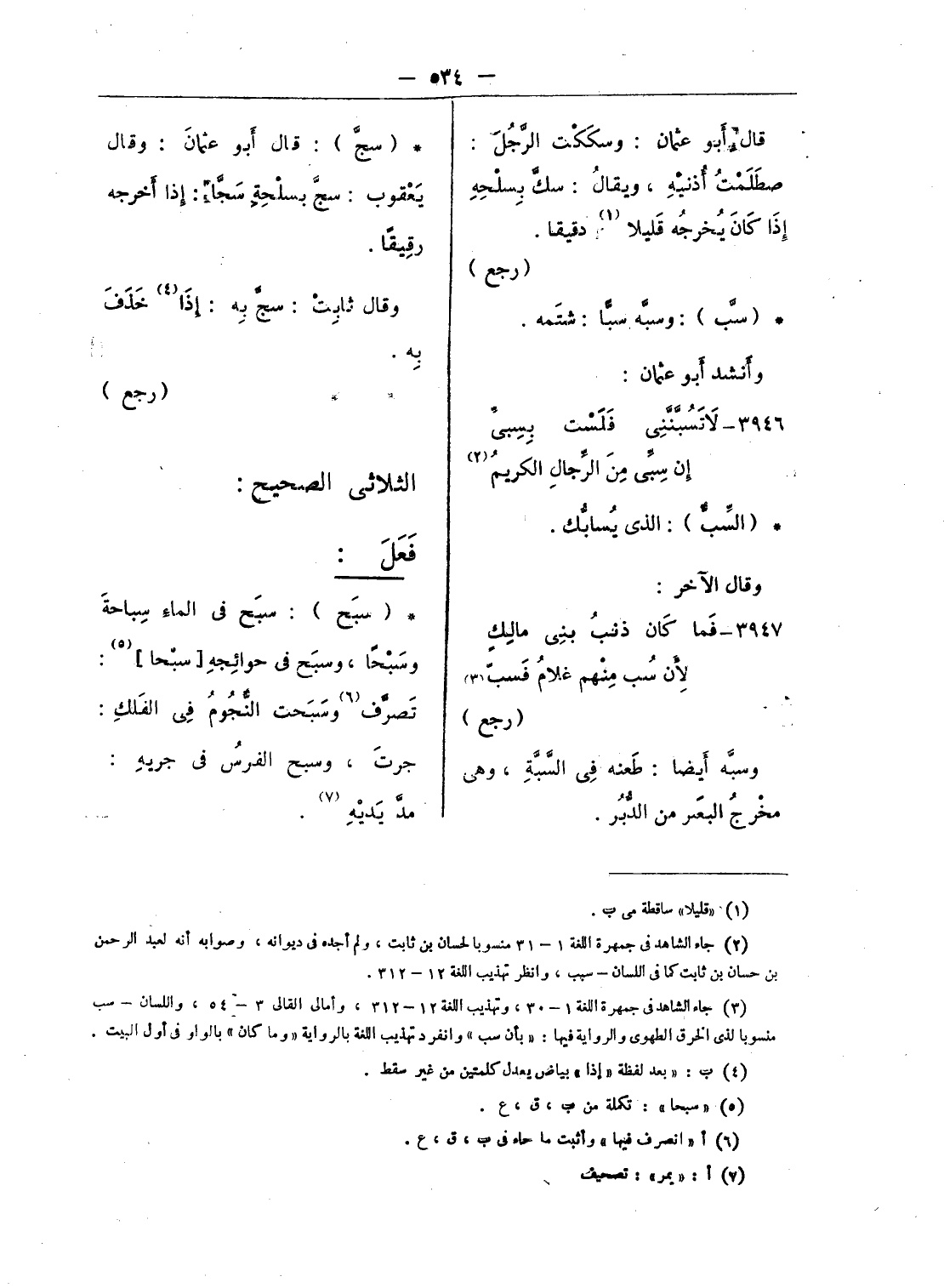 (¬3) جاء الشاهد فى جمهرة اللغة 1 - 30، وتهذيب اللغة 12 - 312، وأمالى القالى 3 - 54، واللسان - سب منسوبا لذى الخرق الطهوى والرواية فيها: «بأن سب» وانفرد تهذيب اللغة بالرواية «وما كان» بالواو فى أول البيت