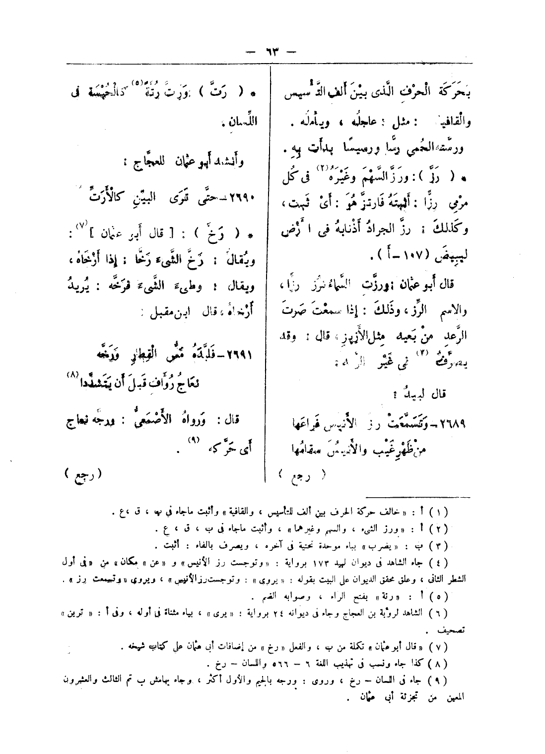 (¬4) جاء الشاهد فى ديوان لبيد 173 برواية: «وتوجست رز الأنيس» و «عن» مكان» من «فى أول الشطر الثانى، وعلق محقق الديوان على البيت بقوله: «يروى»: وتوجست رز الأنيس»، ويروى «وتسمعت رز».
