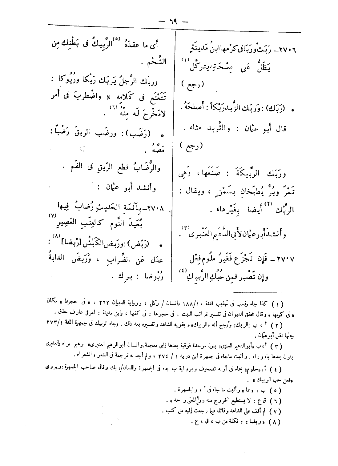 (¬4) أ: «حلوم» بحاء فى أوله تصحيف وبرواية ب جاء فى الجمهرة واللسان/ ربك. وقال صاحب الجمهرة: ويروى «فمن حب الربيك».
