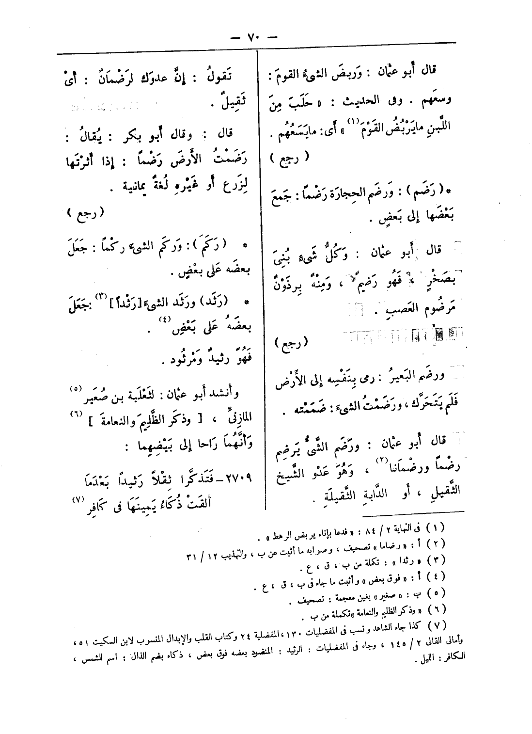 (¬7) كذا جاء الشاهد ونسب في المفضليات 130، المفضلية 24 وكتاب القلب والإبدال المنسوب لابن السكيت 51، وأمالى القالى 2/ 145، وجاء في المفضليات: الرثيد: المنضود بعضه فوق بعض، ذكاء بضم الذال: اسم الشمس، الكافر: الليل.