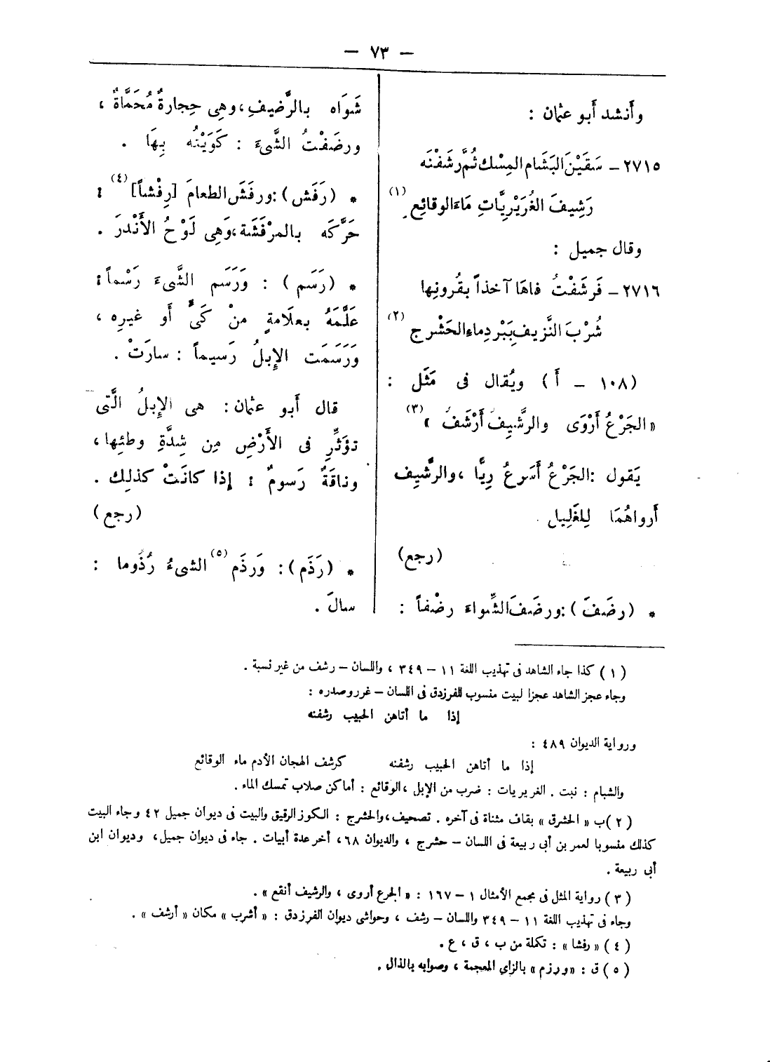 (¬2) ب «الحشرق» بقاف مثناة فى آخره. تصحيف، والحشرج: الكوز الرقيق والبيت فى ديوان جميل 42 وجاء البيت كذلك منسوبا لعمر بن أبى ربيعة فى اللسان - حشرج، والديوان 68، أخر عدة أبيات. جاء فى ديوان جميل، وديوان ابن أبى ربيعة.