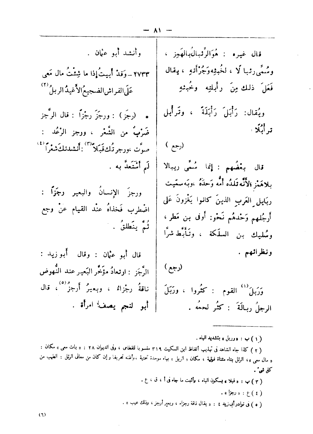 (¬5) فى نوادر أبى زيد 4: «يقال ناقة رجزاء، وبعير أرجز، وذلك عيب».