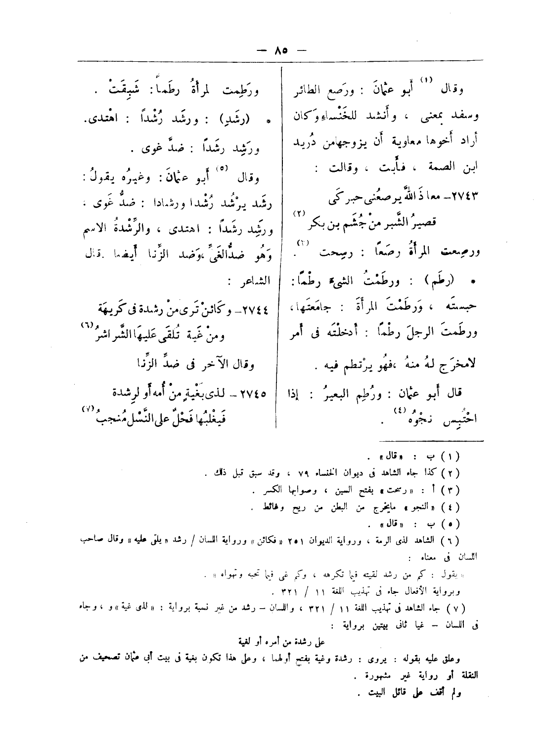 وعلق عليه بقوله: يروى: رشدة وغية بفتح أولهما، وعلى هذا تكون بغية فى بيت أبى عثمان تصحيف من النقلة أو رواية غير مشهورة.