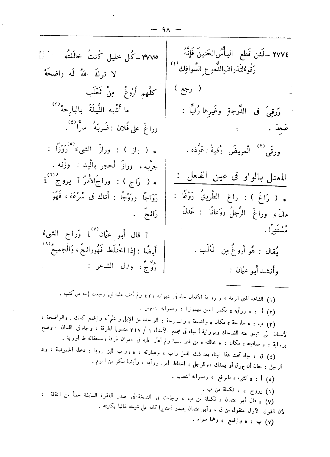 (¬4) ق: جاء تحت هذا البناء بعد ذلك الفعل راب، وعبارته: «وراب اللبن روبا: دخله الحموضة، ود الرجل: حان أن يهرق أو يسفك، والرجل: اختلط أمره ورأيه، وأيضا سكر من النوم.