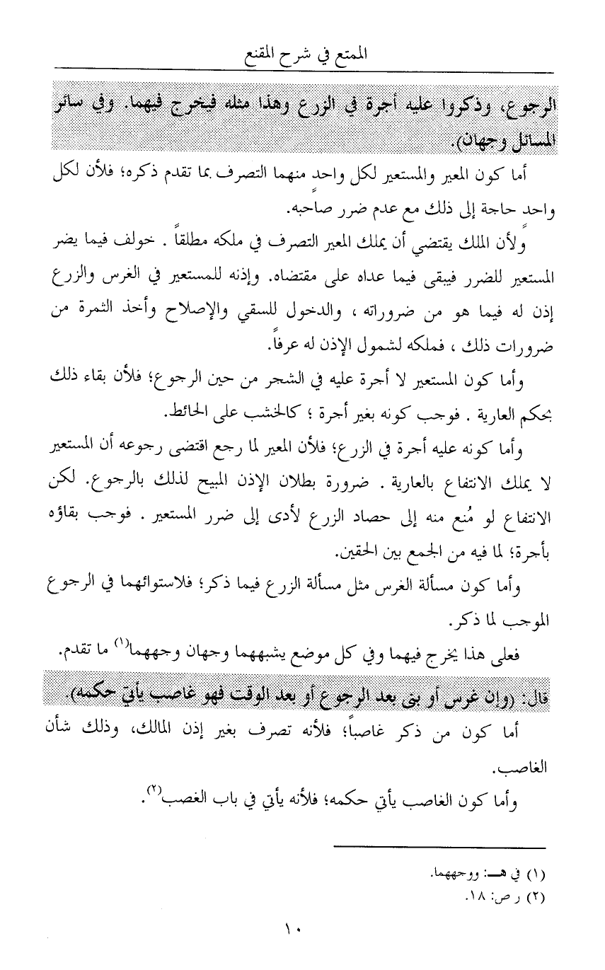 وأما كونه عليه أجرة في الزرع؛ فلأن المعير لما رجع اقتضى رجوعه أن المستعير لا يملك الانتفاع بالعارية. ضرورة بطلان الإذن المبيح لذلك بالرجوع. لكن الانتفاع لو مُنع منه إلى حصاد الزرع لأدى إلى ضرر المستعير. فوجب بقاؤه بأجرة؛ لما فيه من الجمع بين الحقين.