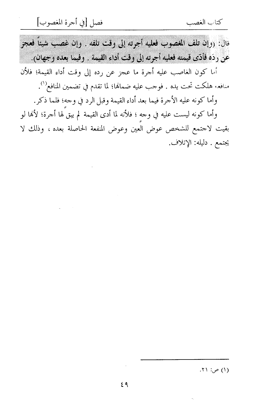 وأما كونه ليست عليه في وجهٍ؛ فلأنه لما أدى القيمة لم يبق لها أجرة؛ لأنها لو بقيت لاجتمع للشخص عوض العين وعوض المنفعة الحاصلة بعده، وذلك لا يجتمع. دليله: الإتلاف.
