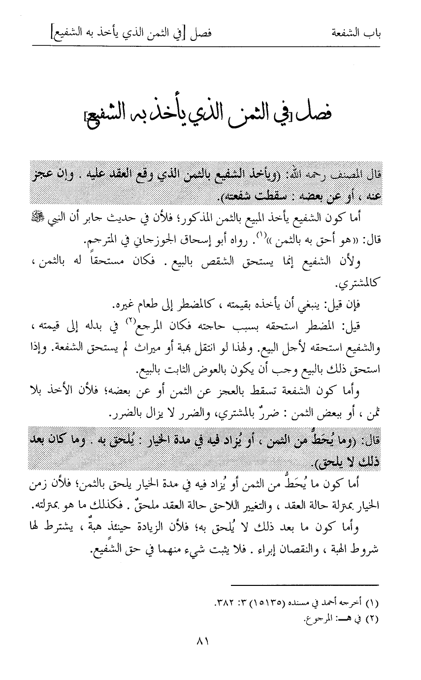 أما كون الشفيع يأخذ المبيع بالثمن المذكور؛ فلأن في حديث جابر أن النبي صلى الله عليه وسلم قال: «هو أحق به بالثمن» (¬1). رواه أبو إسحاق الجوزجاني في المترجم.