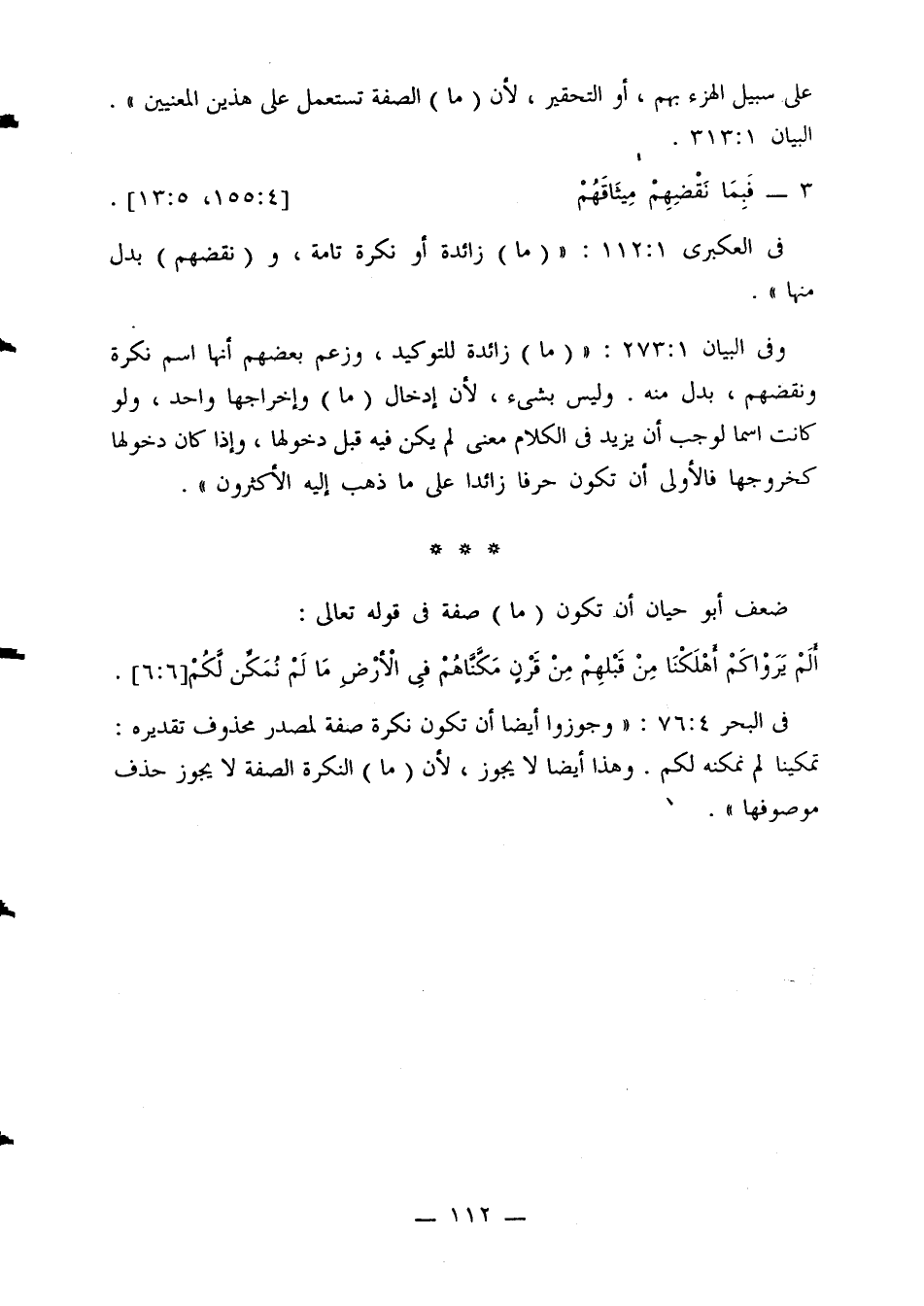 في البحر 4: 76: «وجوزوا أيضًا أن تكون نكرة صفة لمصدر محذوف تقديره: تمكينا لم نمكنه لكم. وهذا أيضًا لا يجوز، لأن (ما) النكرة الصفة لا يجوز حذف موصوفها».