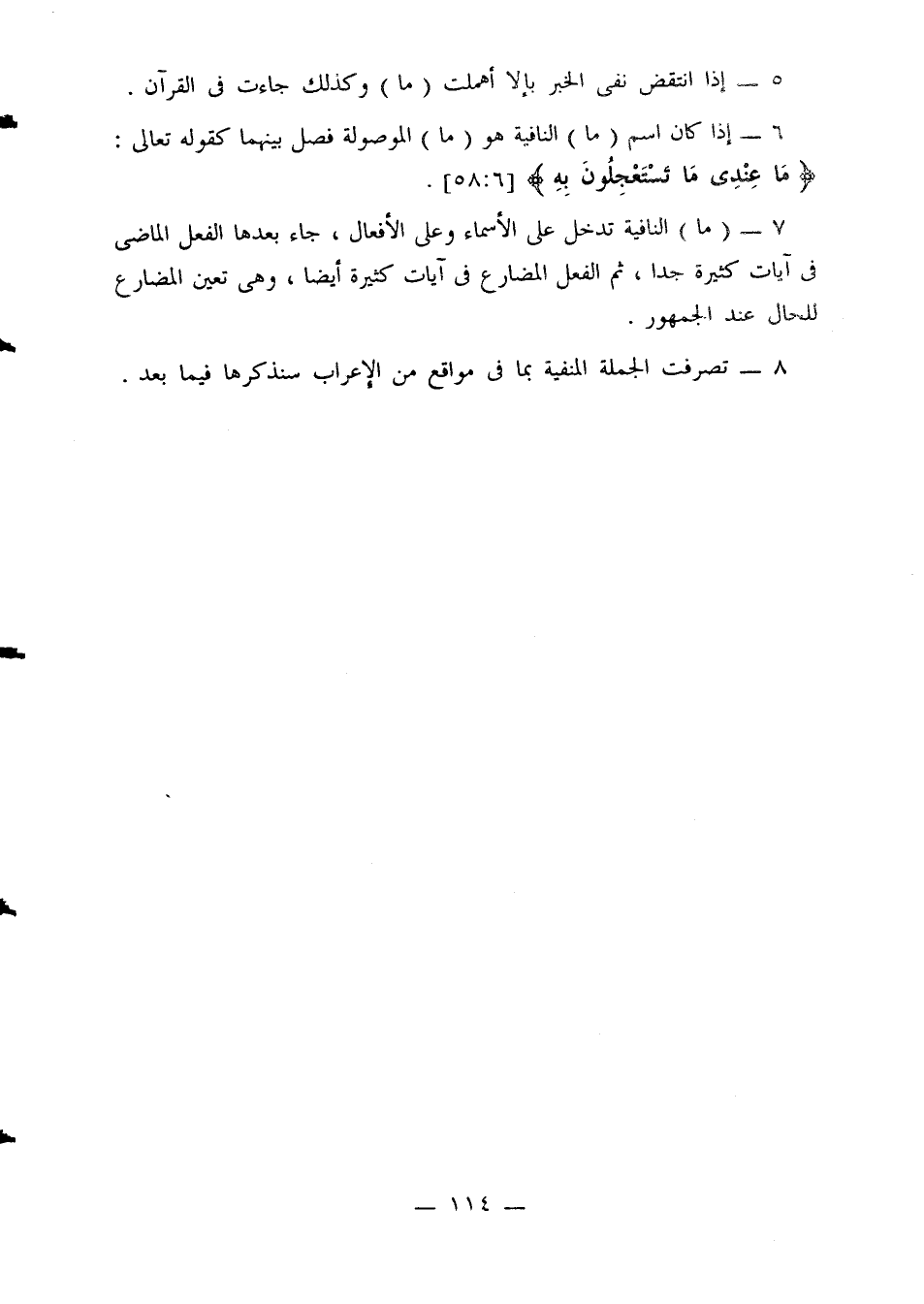 7 - (ما) النافية تدخل على الأسماء وعلى الأفعال، جاء بعدها الفعل الماضي في آيات كثيرة جدًا، ثم الفعل المضارع في آيات كثيرة أيضًا، وهي تعين المضارع للحال عند الجمهور.