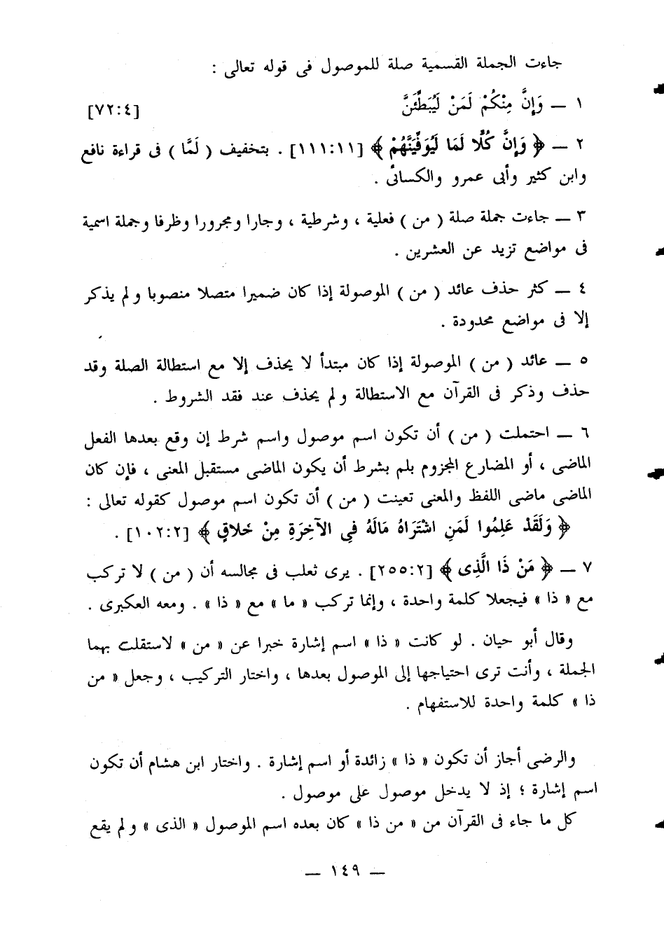 5 - عائد (من) الموصولة إذا كان مبتدأ لا يحذف إلا مع استطالة الصلة وقد حذف وذكر في القرآن مع الاستطالة ولم يحذف عند فقد الشروط.
