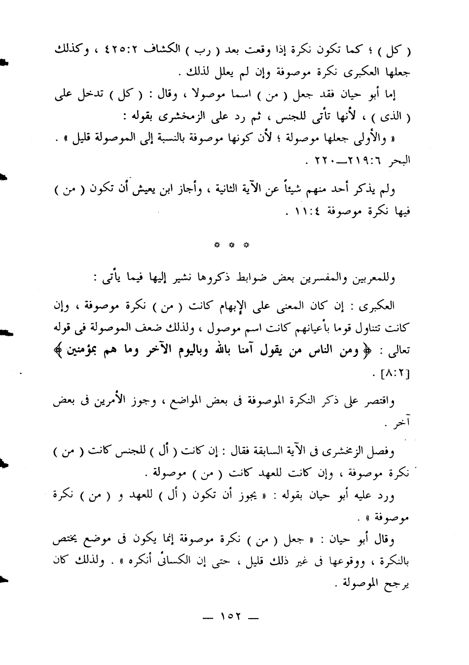 العكبري: إن كان المعنى على الإبهام كانت (من) نكرة موصوفة، وإن كانت تتناول قوما بأعيانهم كانت اسم موصول، ولذلك ضعف الموصولة في قوله تعالى: {ومن الناس من يقول آمنا بالله وباليوم الآخر وما هم بمؤمنين} [2: 8].