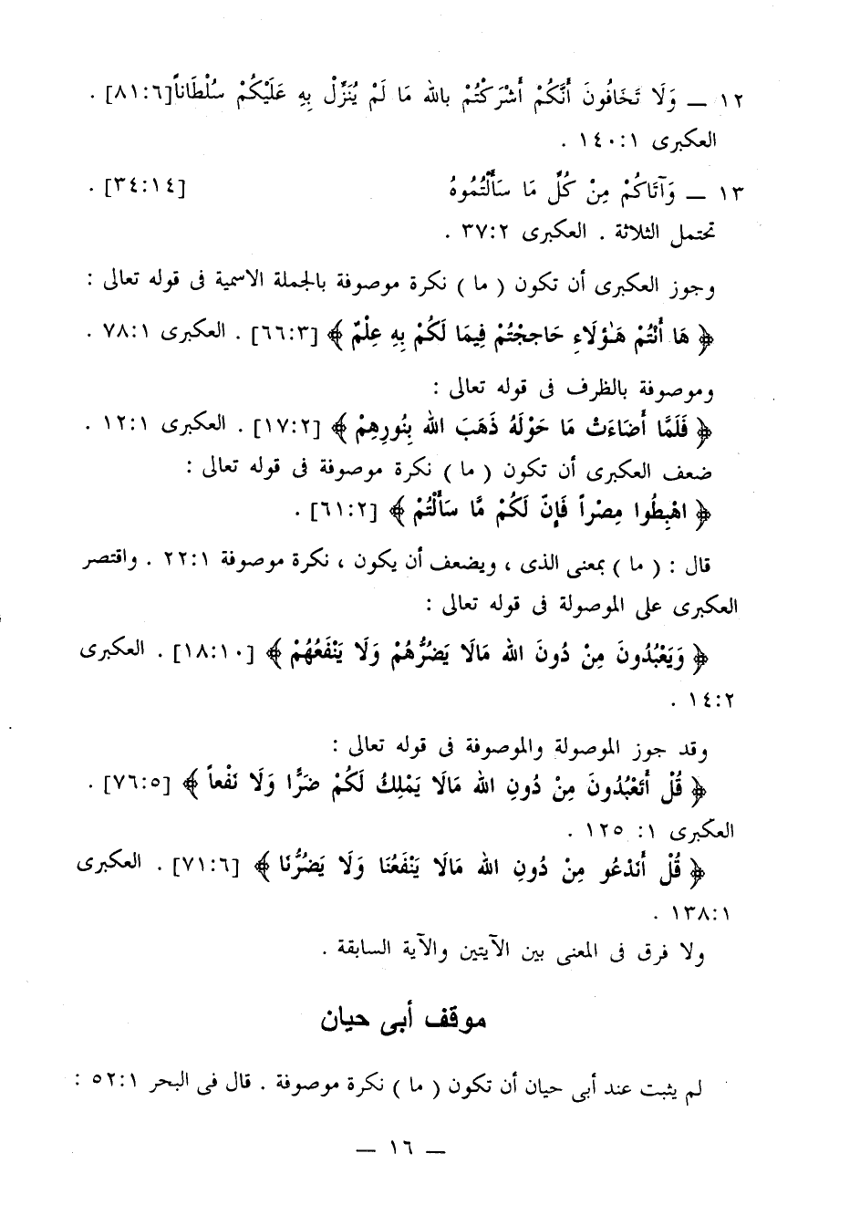12 - {ولا تخافون أنكم أشركتم بالله ما لم ينزل به عليكم سلطانا} [6: 81]، العكبري 1: 140.