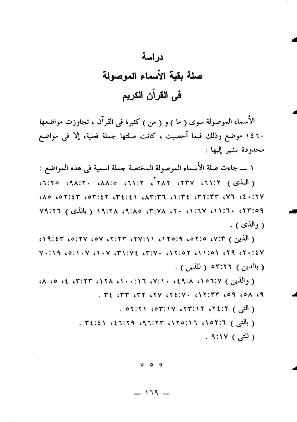 1 - جاءت صلة الأسماء الموصولة المختصة جملة اسمية في هذه المواضع: (الذي) 2: 61، 237، 282، 2: 61، 5: 88، 20: 98، 25: 6، 27: 40، 76، 33: 32، 34: 1، 36: 83، 41: 34، 42: 53، 43: 52، 85، 59: 23، 60: 11، 67: 1، 20، 78: 3، 85: 9، 28: 19 (بالذي) 26: 79 (والذي).