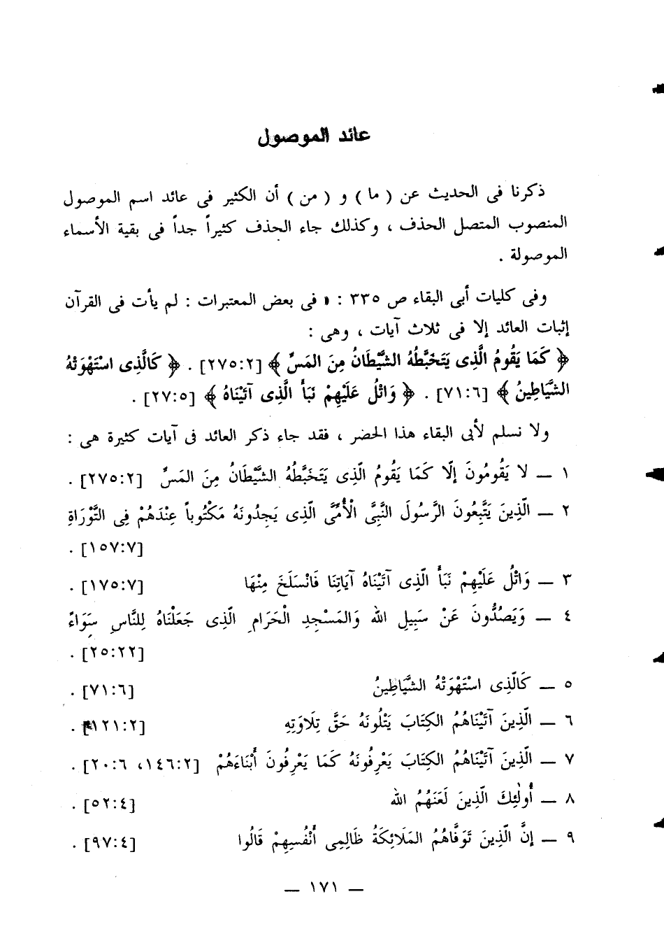 وفي كليات أبي البقاء ص 335: «في بعض المعتبرات: لم يأت في القرآن إثبات العائد إلا في ثلاث آيات، وهي: