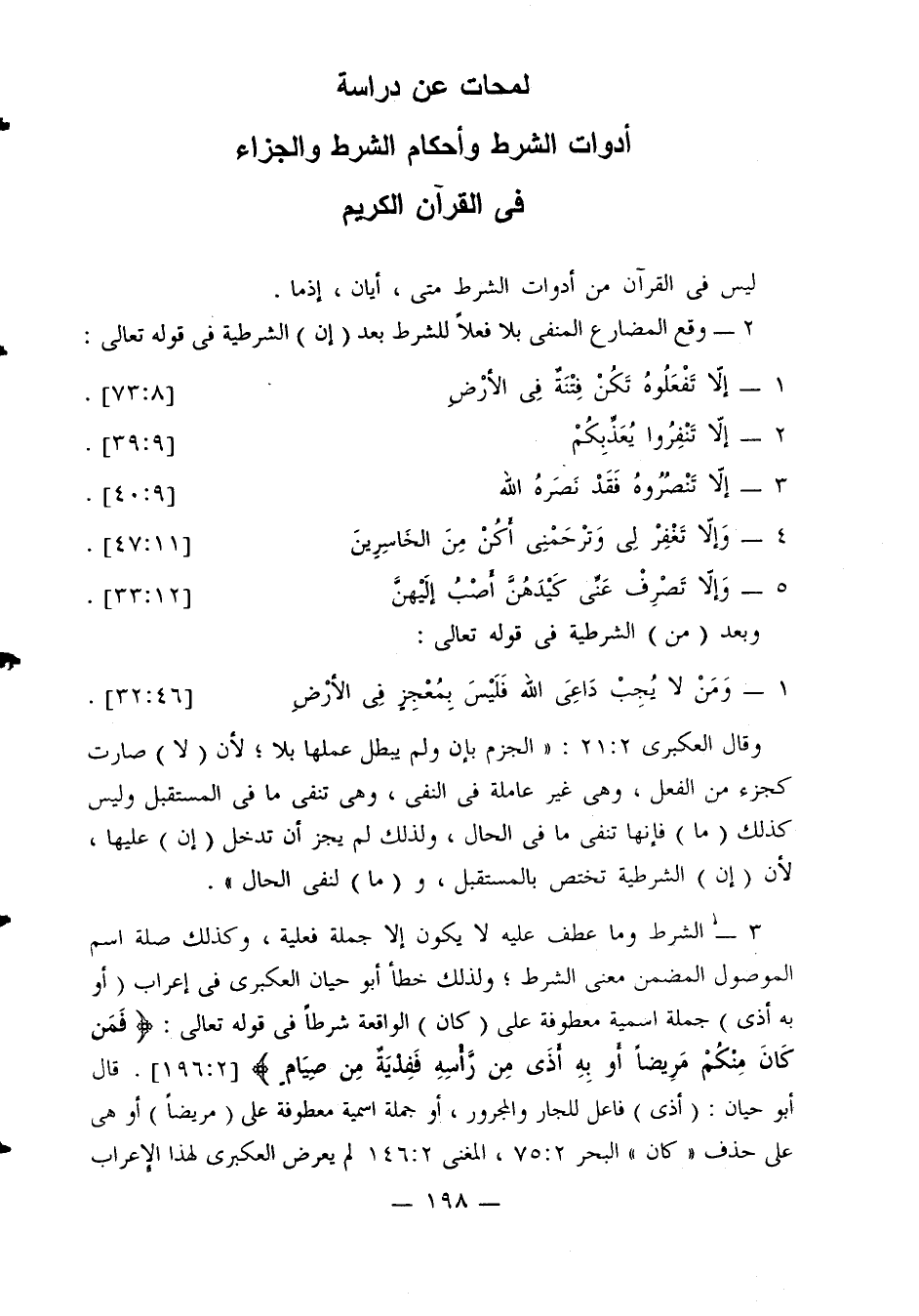 3 - الشرط وما عطف عليه لا يكون إلا جملة فعلية، وكذلك صلة اسم الموصول المضمن معنى الشرط؛ ولذلك خطأ أبو حيان العكبري في إعراب (أو به أذى) جملة اسمية معطوفة على (كان) الواقعة شرطًا في قوله تعالى: {فمن كان منكم مريضا أو به أذى من رأسه ففدية من صيام} [2: 196]. قال أبو حيان: (أذى) فاعل للجار والمجرور، أو جملة اسمية معطوفة على (مريضا) أو هي على حذف «كان» البحر 2: 75، المغني 2: 146 لم يعرض العكبري لهذا الإعراب