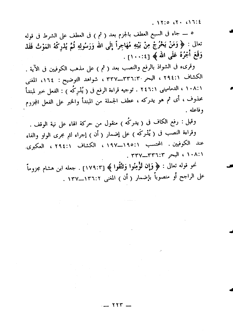 الكشاف 1: 294، البحر 3: 336 - 337، شواهد التوضيح: 164، المغني 1: 108، الدماميني 1: 246. توجيه قراءة الرفع في (يدركه): الفعل خبر لمبتدأ محذوف، أي ثم هو يدركه، عطف الجملة من المبتدأ والخبر على الفعل المجزوم وفاعله.