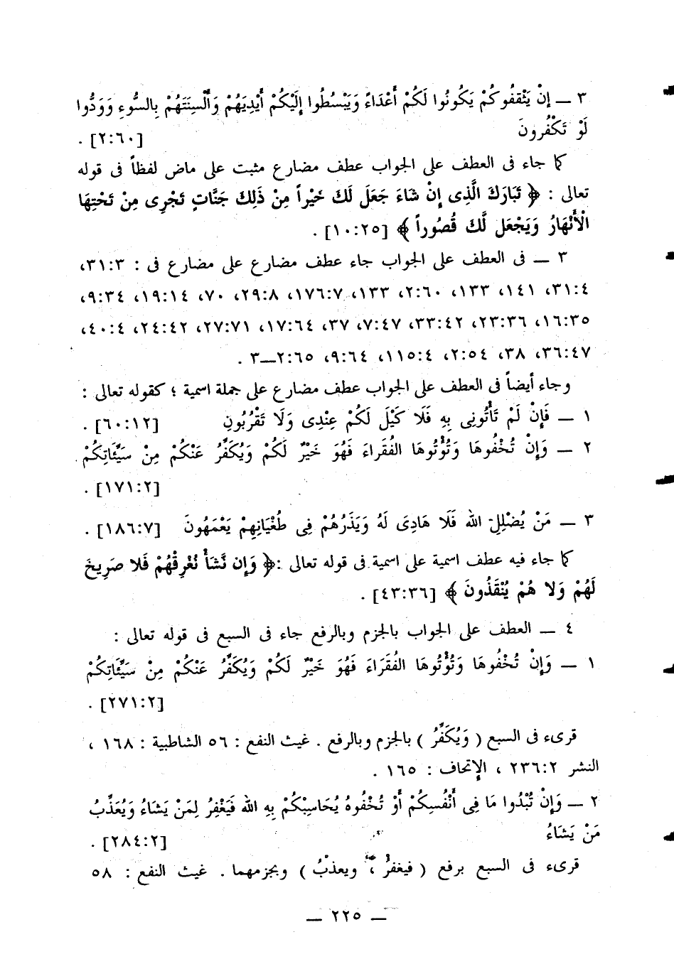 3 - في العطف على الجواب جاء عطف مضارع على مضارع في 3: 31، 4: 31، 141، 133، 60: 2، 133، 7: 176، 8: 29، 70، 14: 19، 34: 9، 35: 16، 36: 23، 42: 33، 47: 7، 37، 64: 17، 71: 27، 42: 24، 4: 40، 47: 36، 38، 54: 2، 4: 115، 64: 9، 65: 2 - 3.