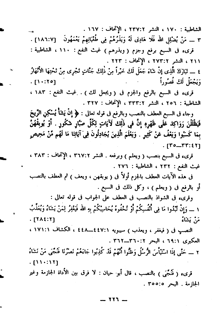 وجاء في السبع العطف بالنصب وبالرفع في قوله تعالى: {إن يشأ يسكن الريح فيظللن رواكد على ظهره إن في ذلك لآيات لكل صبار شكور. أو يوبقهن بما كسبوا ويعف عن كثير. ويعلم الذين يجادلون في آياتنا ما لهم من محيص} [42: 33 - 35].